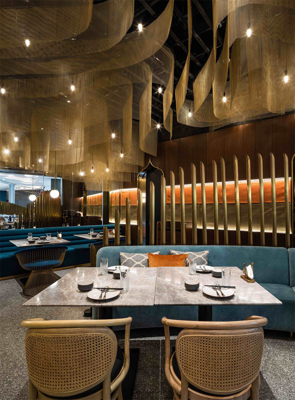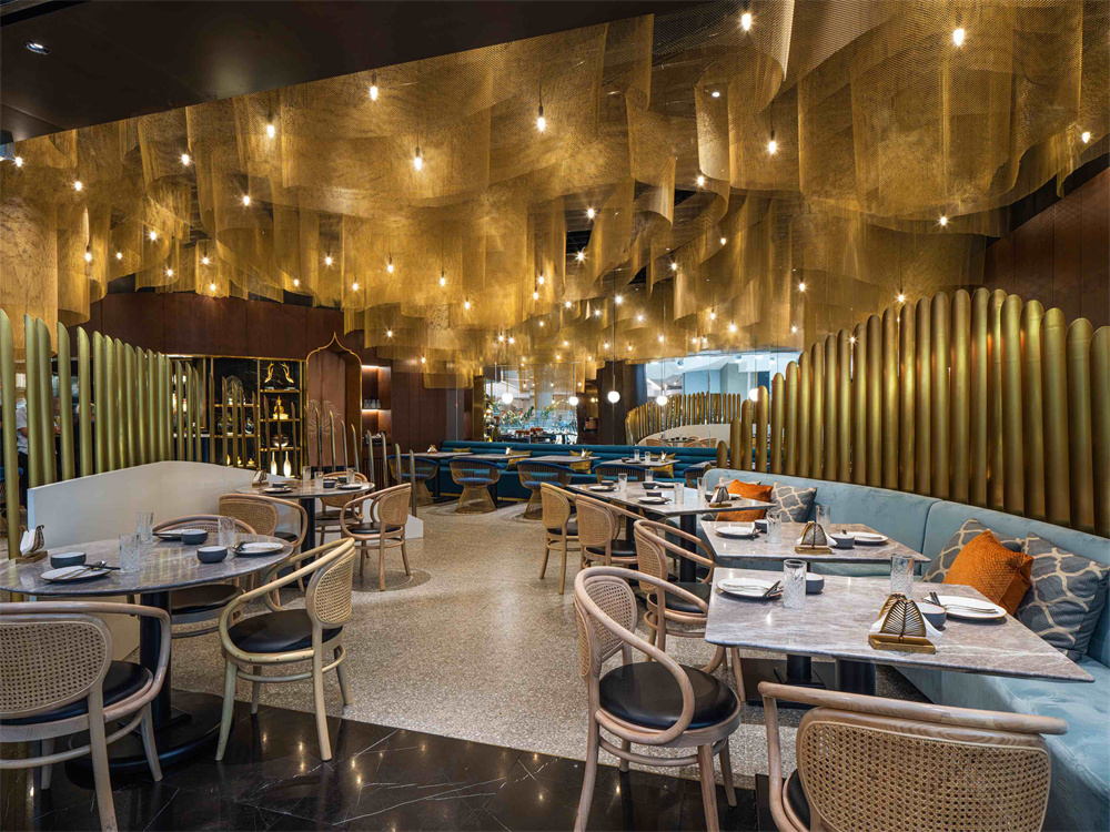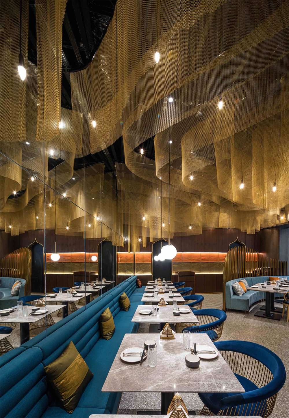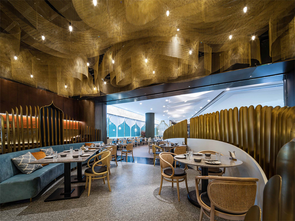 餐厅的主用餐区是对阿普萨拉舞者所穿的皇家服饰的抽象演绎。天花板的设计受到舞者头饰上球形图案的启发,在用餐区上方曲折蜿蜒、无限延伸。金色网格的动态曲线设计模仿舞者活跃的手部动作,仿佛她在上空优雅表演时,手指和手势清晰的轮廓。