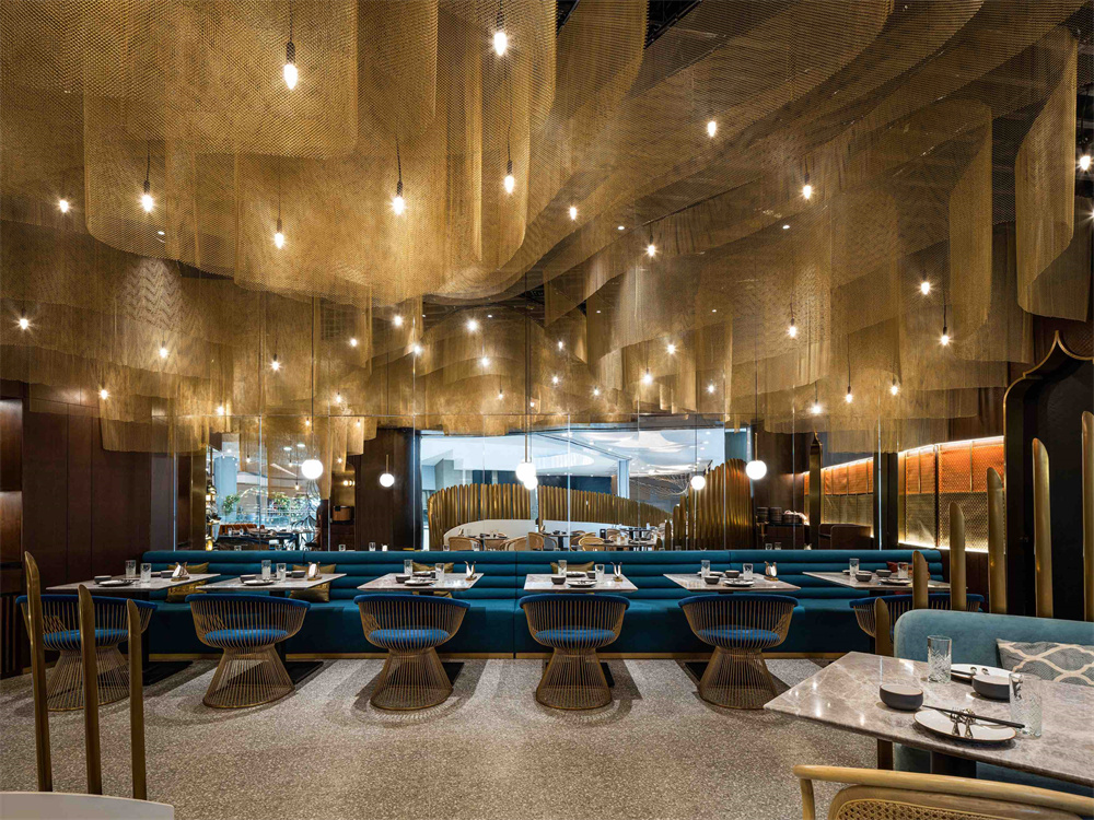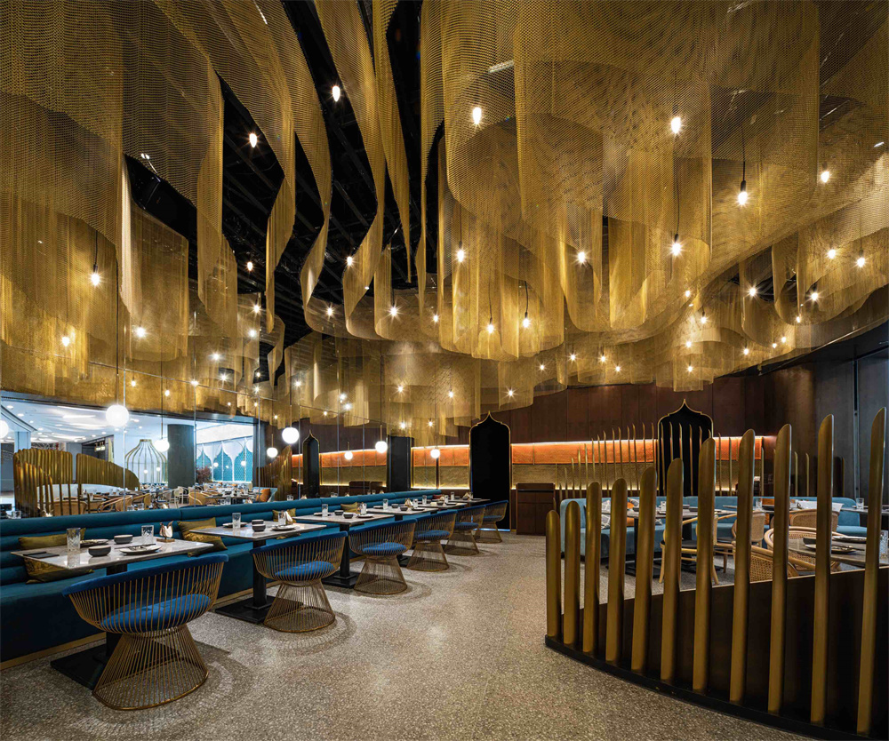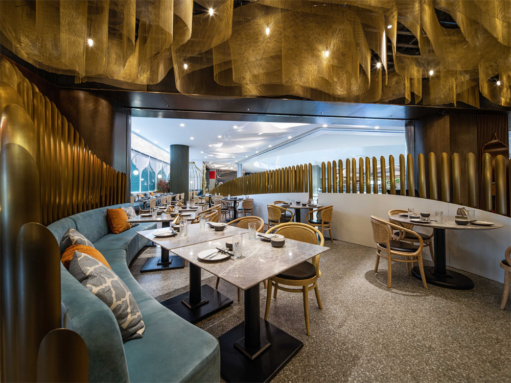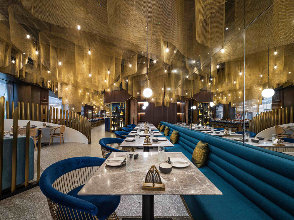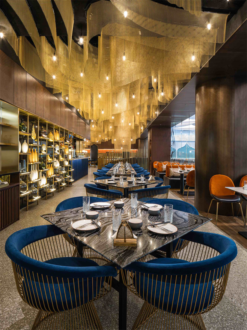餐厅的主用餐区是对阿普萨拉舞者所穿的皇家服饰的抽象演绎。天花板的设计受到舞者头饰上球形图案的启发,在用餐区上方曲折蜿蜒、无限延伸。金色网格的动态曲线设计模仿舞者活跃的手部动作,仿佛她在上空优雅表演时,手指和手势清晰的轮廓。