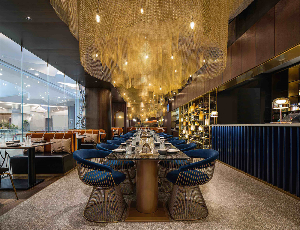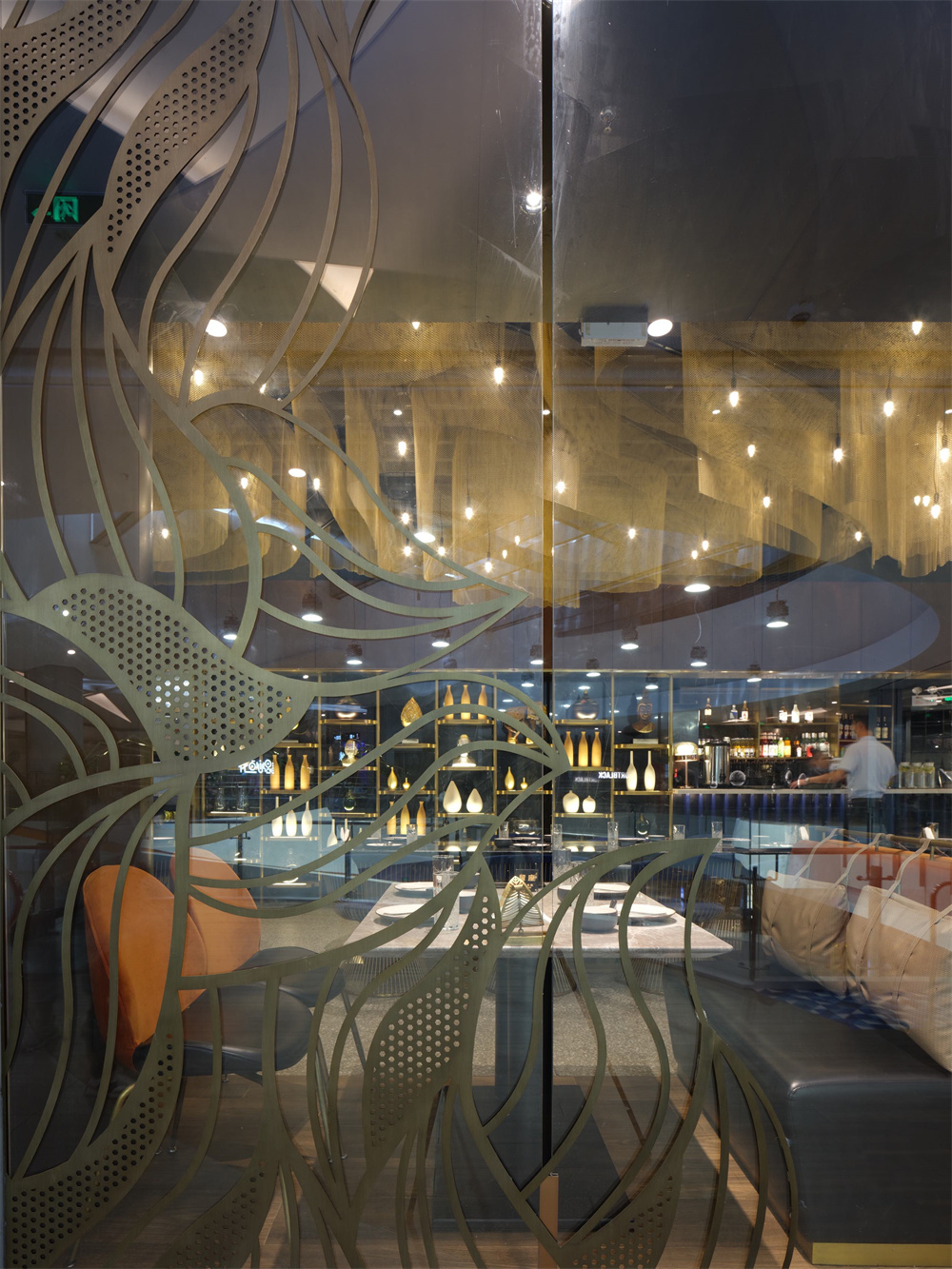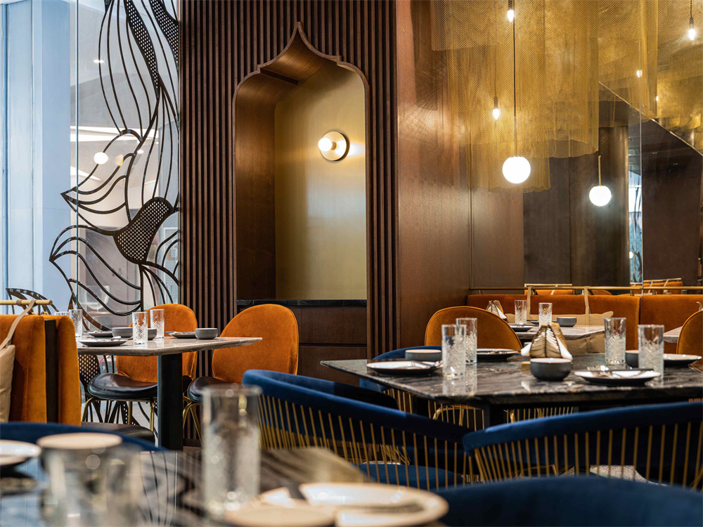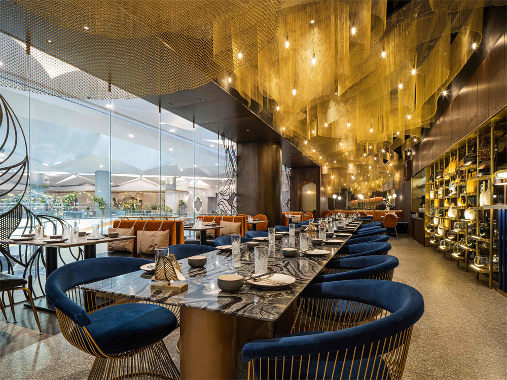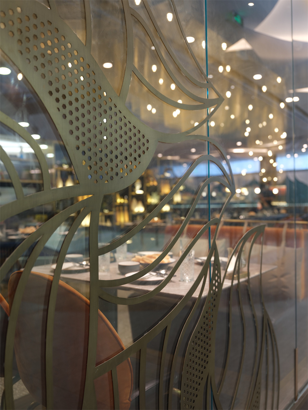 餐厅的主用餐区是对阿普萨拉舞者所穿的皇家服饰的抽象演绎。天花板的设计受到舞者头饰上球形图案的启发,在用餐区上方曲折蜿蜒、无限延伸。金色网格的动态曲线设计模仿舞者活跃的手部动作,仿佛她在上空优雅表演时,手指和手势清晰的轮廓。