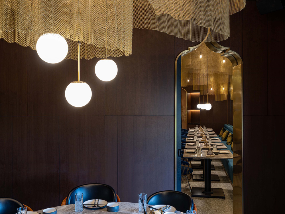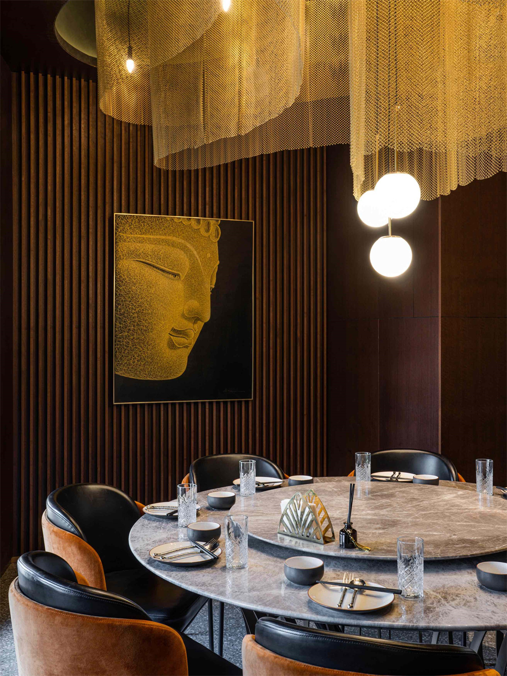 Past the dining hall, two brass archways informed by the ornate triangular roof profiles of traditional Thai temples lead guests into the private dining area. The intimate rooms are divided by brass metallic screens with intricate patterns inspired by the metallic threads of Thai silk embroidery. A dark walnut timber palette allows the focus to fall on the bespoke gold mesh chandelier cascading down from the centre of the ceiling.