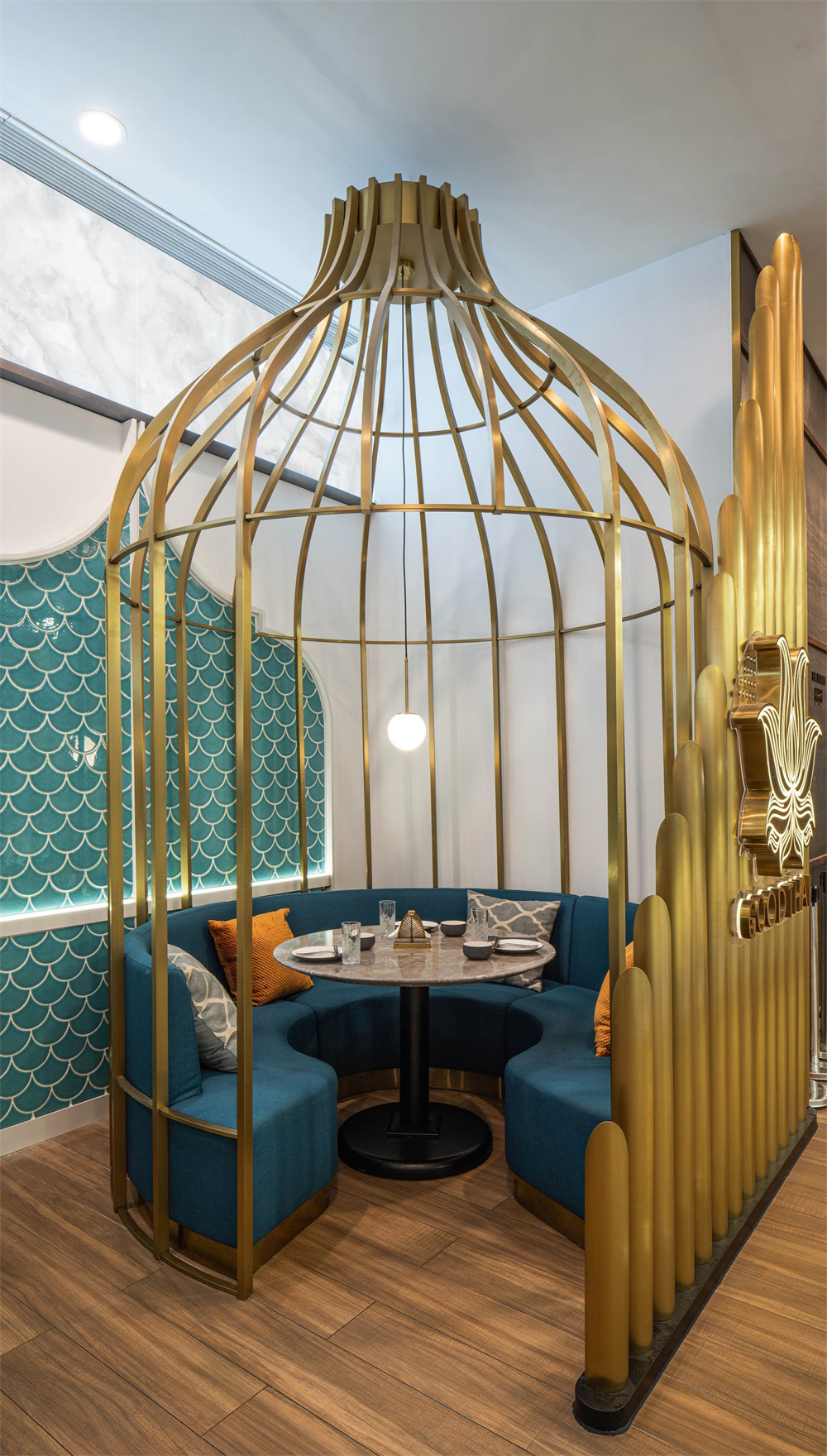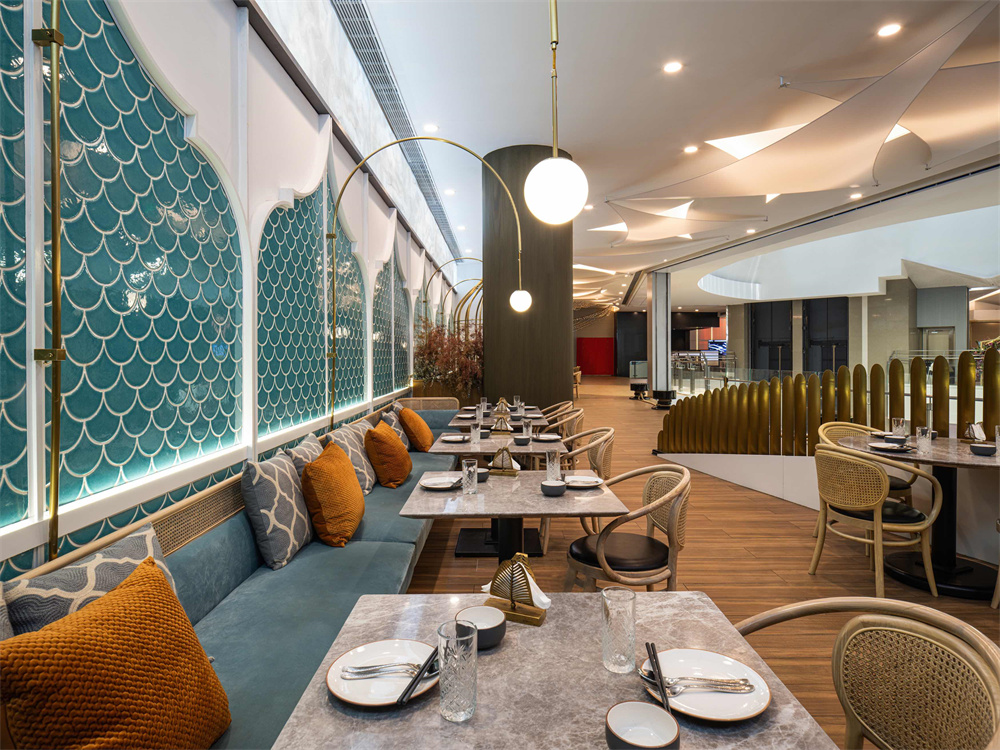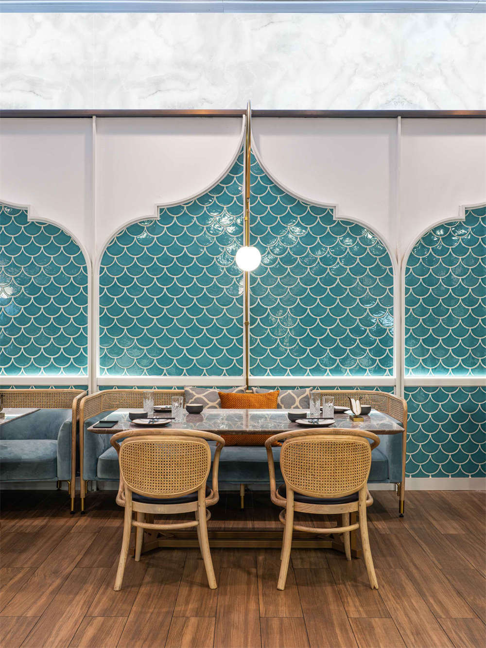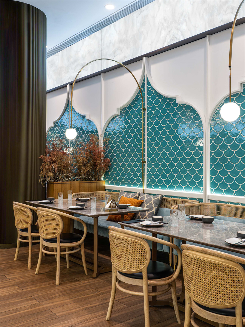 A row of sweeping vertical brass slats flow outwards from the main dining hall to the outdoor dining area as the overall material palette transition into a lighter tone with sofas of light blue upholstery, rattan chairs and turquoise tiles.