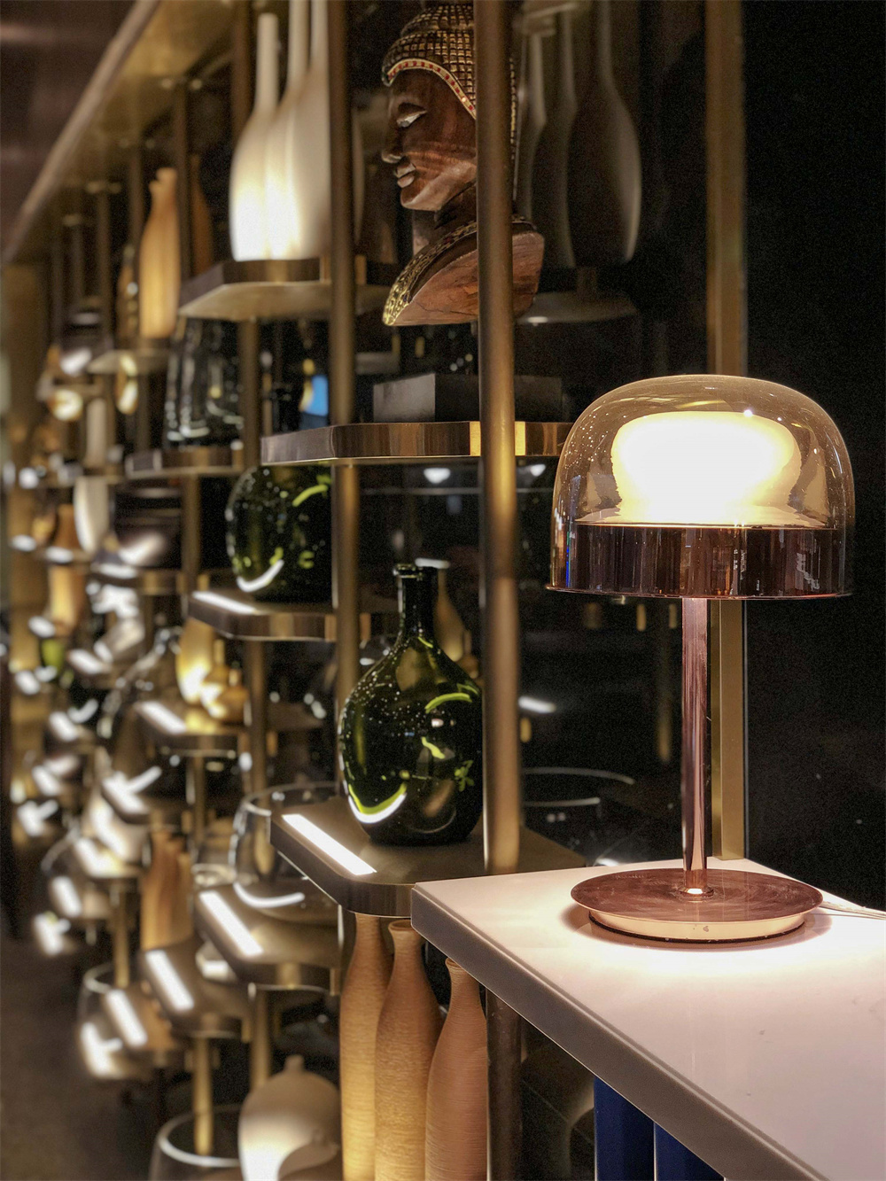The dining area is clad in dark timber finishes, accentuated with tones of navy blue, orange, and gold upholstery inspired by the ‘Pha Nuang’, a pleated silk brocade that is worn by the dancer. A composition of brass furniture and metallic detailing reflect the decorative accessories and gold-colored copper ornaments found on the collars and wrists of the dancer.