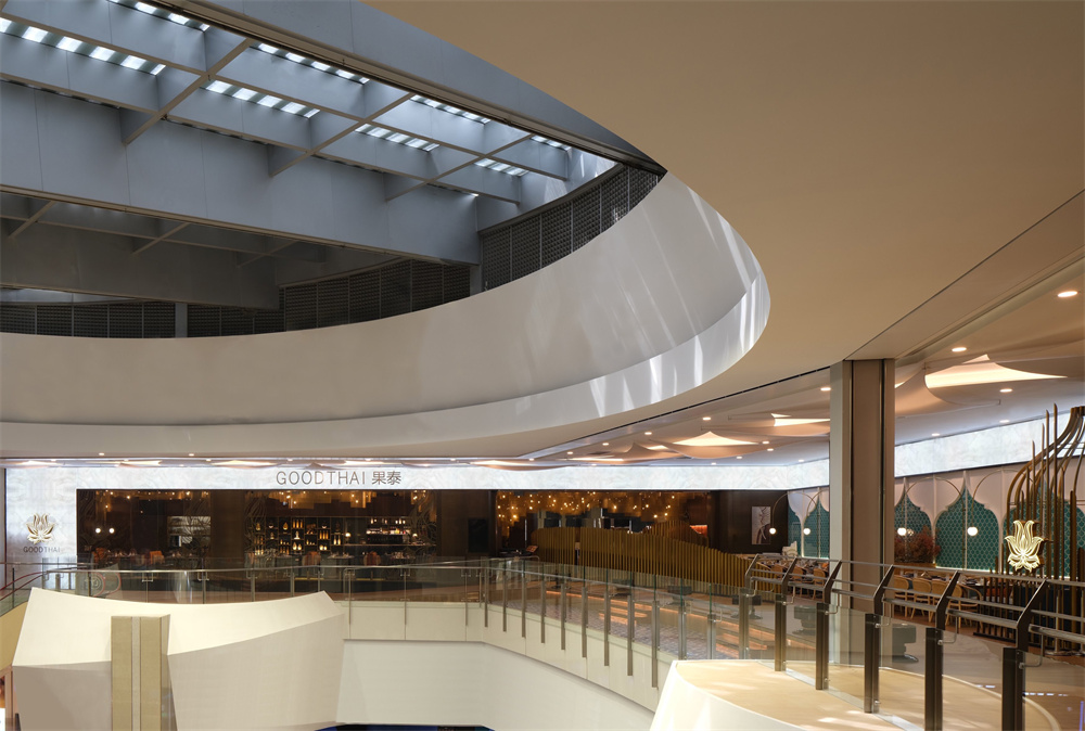 餐厅的设计借鉴了阿普萨拉舞姿的剪影,将舞动的韵律感转化成一种当代建筑体验,在唤起流动性和动感的同时,以大气的选材、设计图案和细节来庆祝泰国固有的文化和美学。