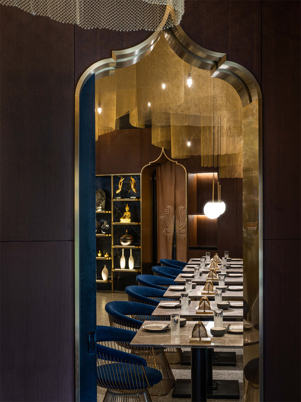 穿过用餐区有两个黄铜拱门,带领客人到达包房用餐区,其造型来自传统泰国庙宇华丽的三角形屋顶侧影。这些私密的房间由黄铜金属屏风隔开,屏风上复杂图案的灵感来自泰国丝绸刺绣里的金属线。深色胡桃木调色板让视觉焦点落在从天花板层层垂落的定制金色金属吊灯上。