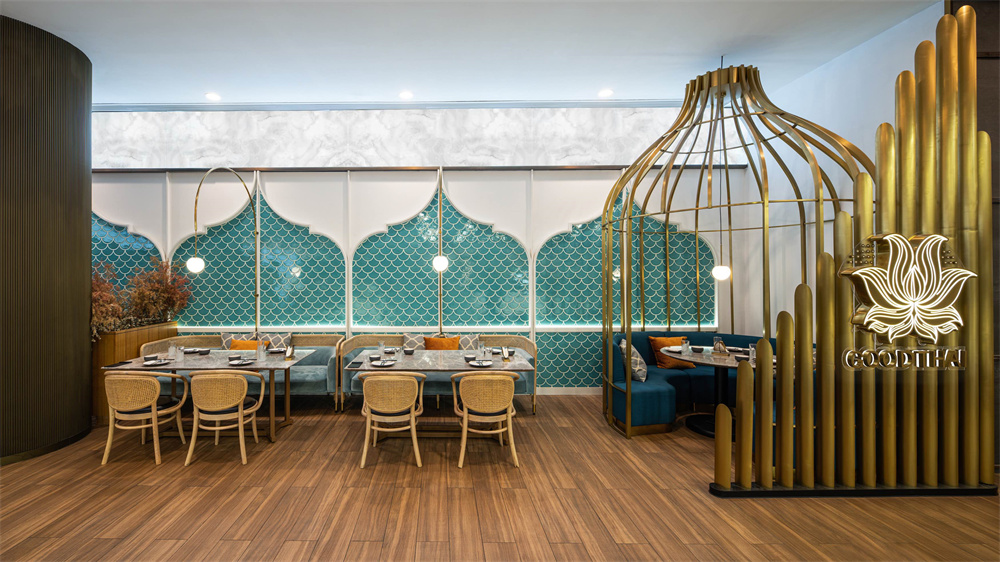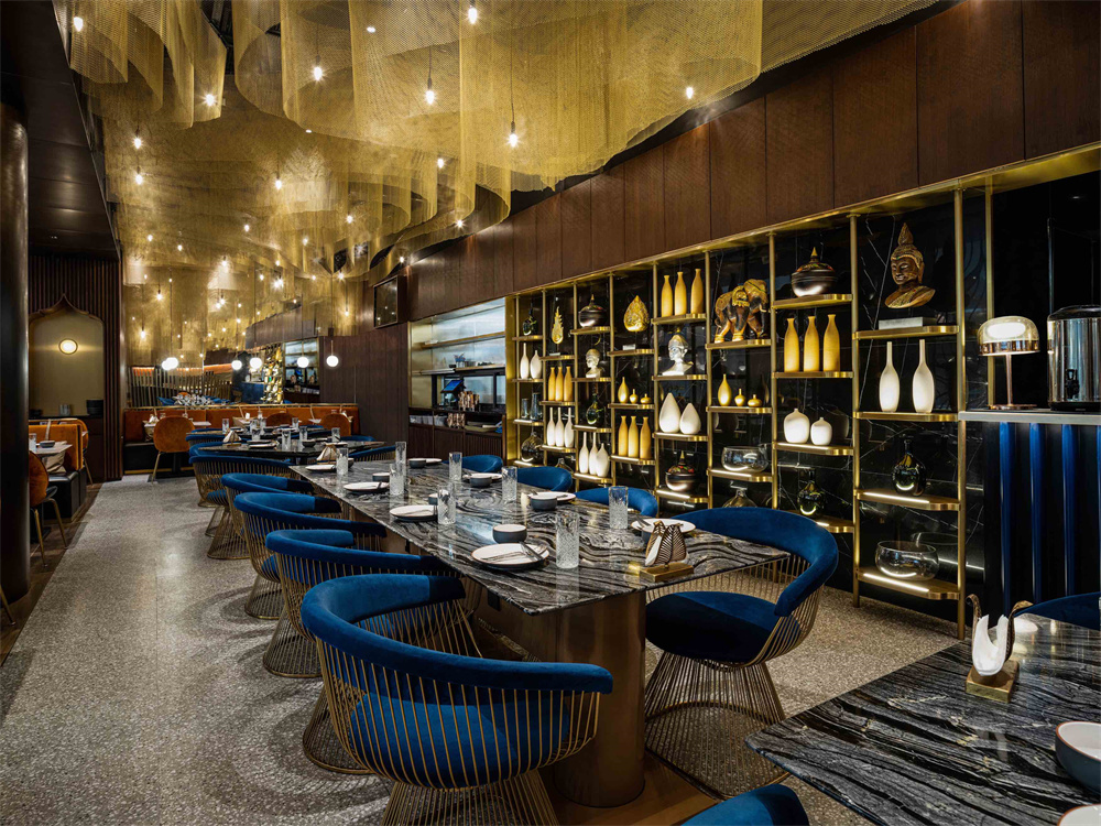 The design of the eatery draws from the silhouettes of the Apsara dance movements, translating this sense of rhythm into a contemporary architectural experience that evokes fluidity and motion whilst celebrating the intrinsic Thai culture and aesthetics with majestic materiality, motifs, and detailing.