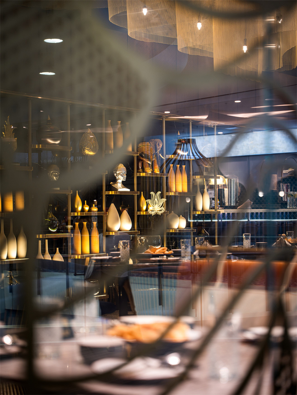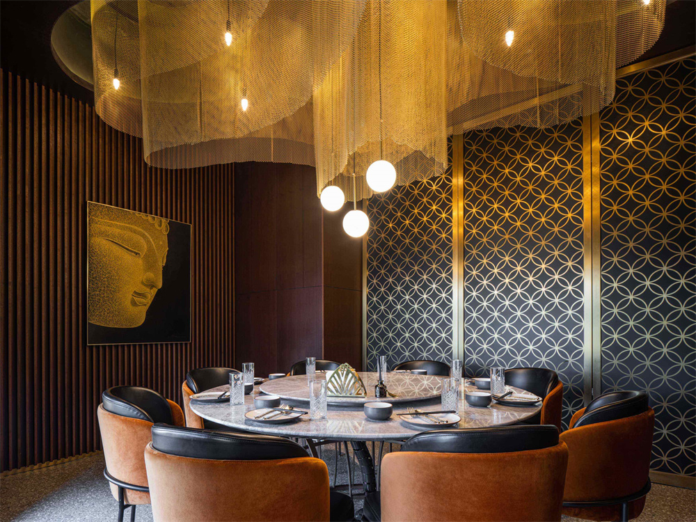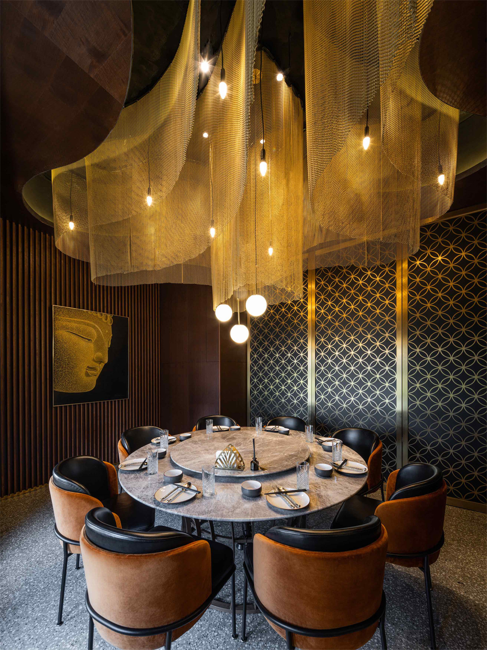 The main dining hall of the restaurant is an abstract interpretation of the royal costumes donned by the Apsara dancer. The spherical motifs of the headdress serves as the main inspiration for the sculptured ceiling that appears to curve and weave endlessly above the dining area. The sweeping curvilinear motion of the gold mesh mimics the dynamic hand movements of the dancer as she appears to be gracefully performing above, articulating the silhouettes of her fingers and hand gestures.