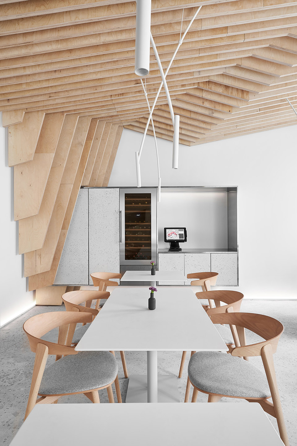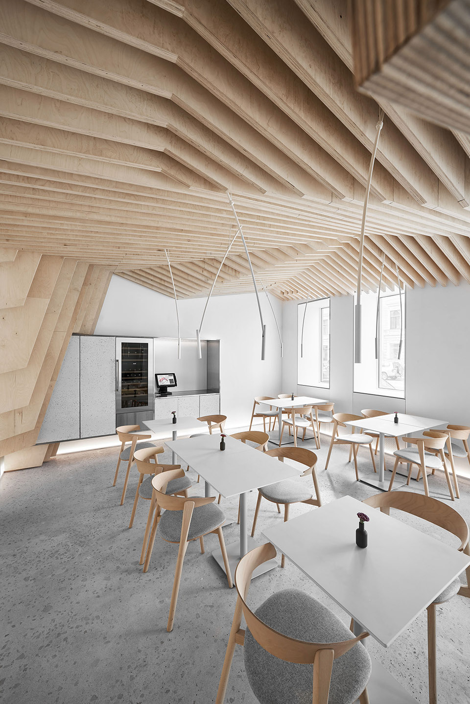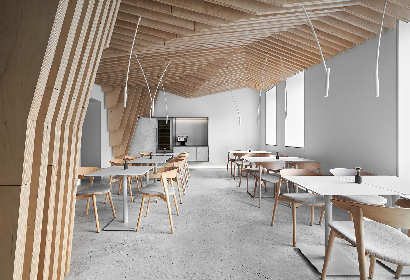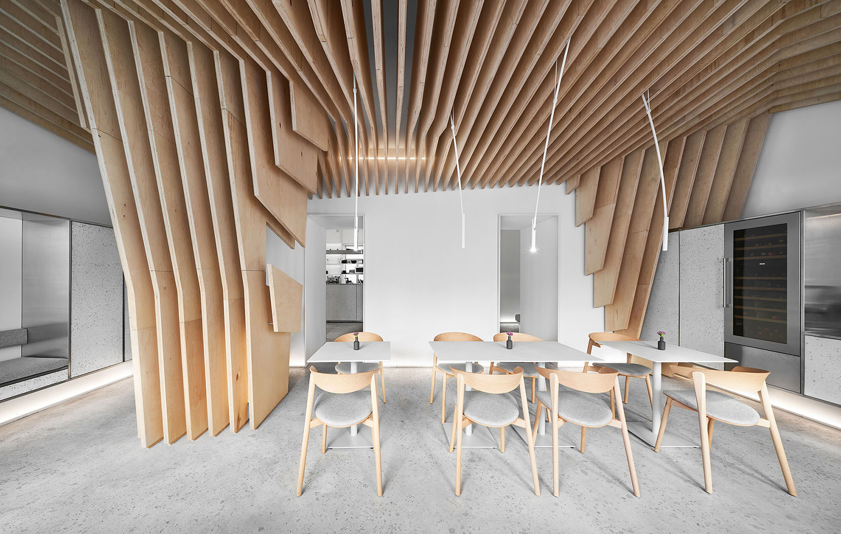 作为视觉的参照,设计结合了日本和斯堪的纳维亚的极简主义。设计者想要做出极度干净和简约的设计,以此将视觉重点聚焦在食物上而不是在装潢上——这是为什么空间的墙面都被粉刷成了白色、所有功能性元素都是由不锈钢制作而成、定制的桌子和白色的餐具,都在强调餐厅的餐品。