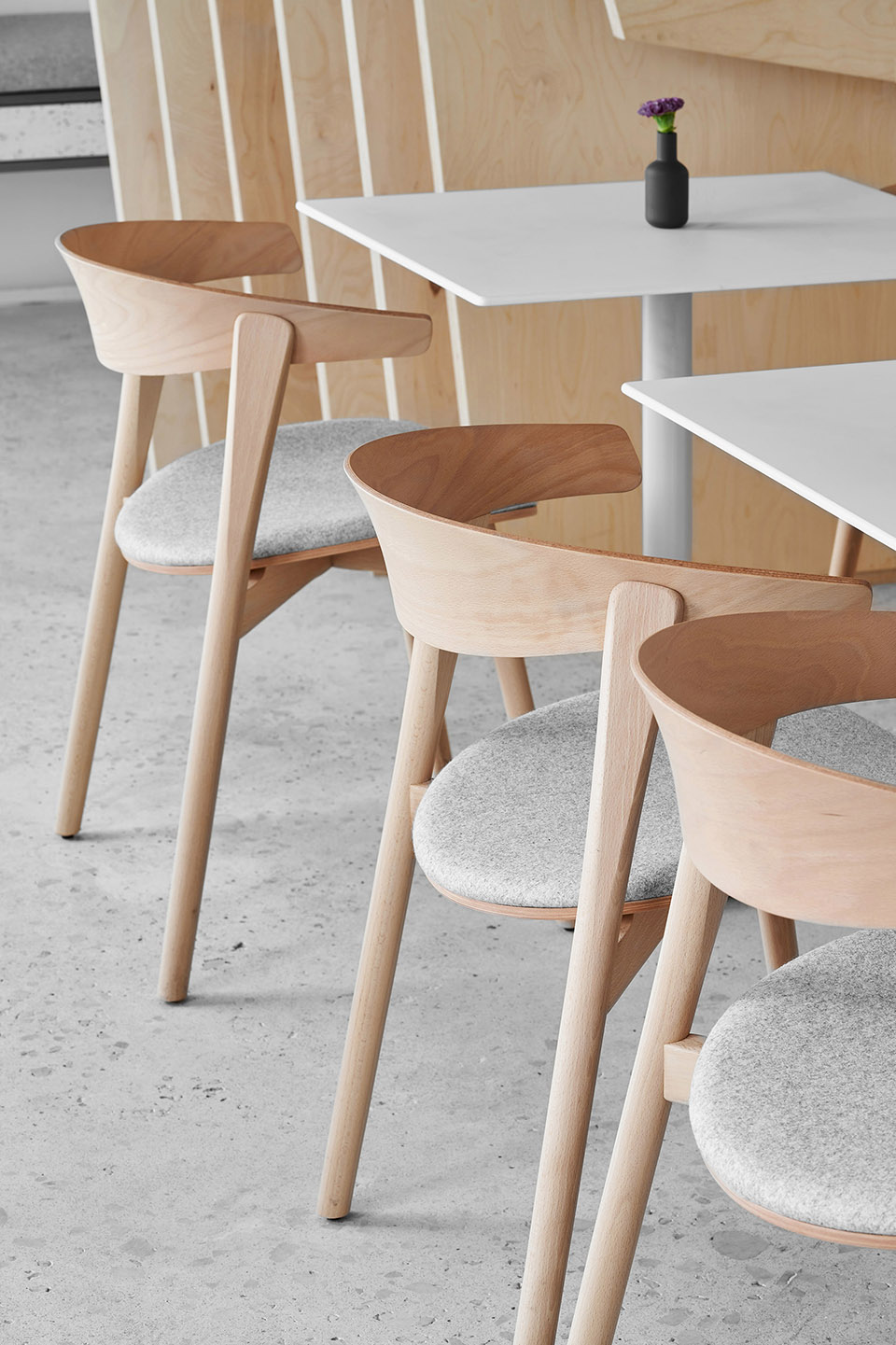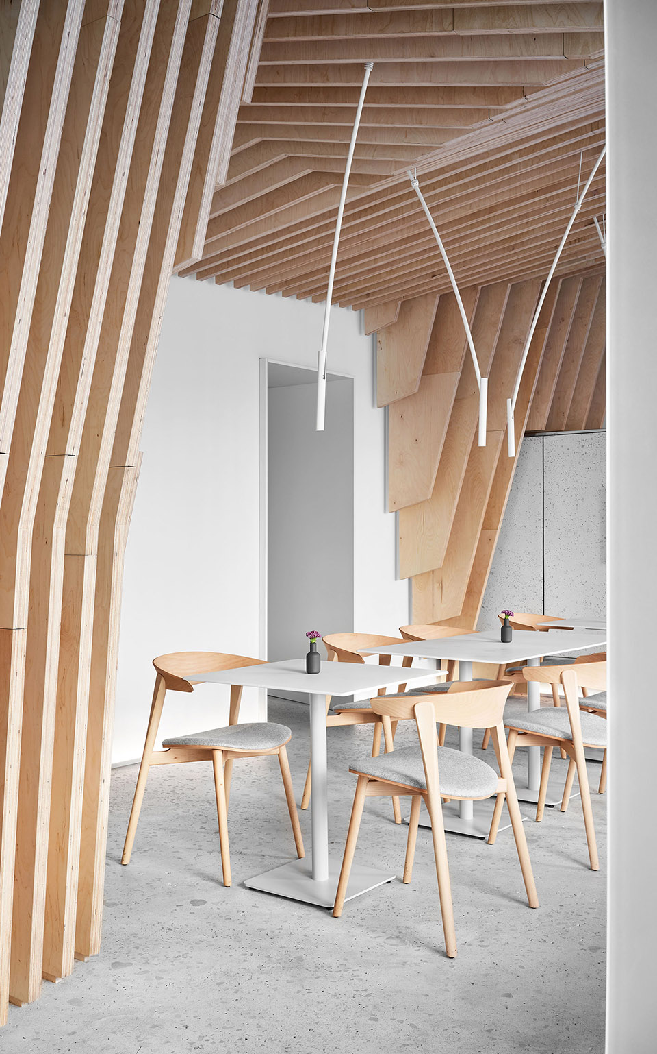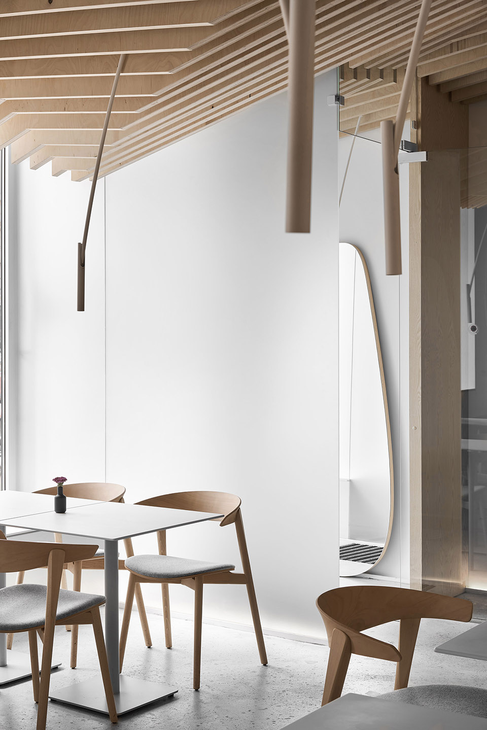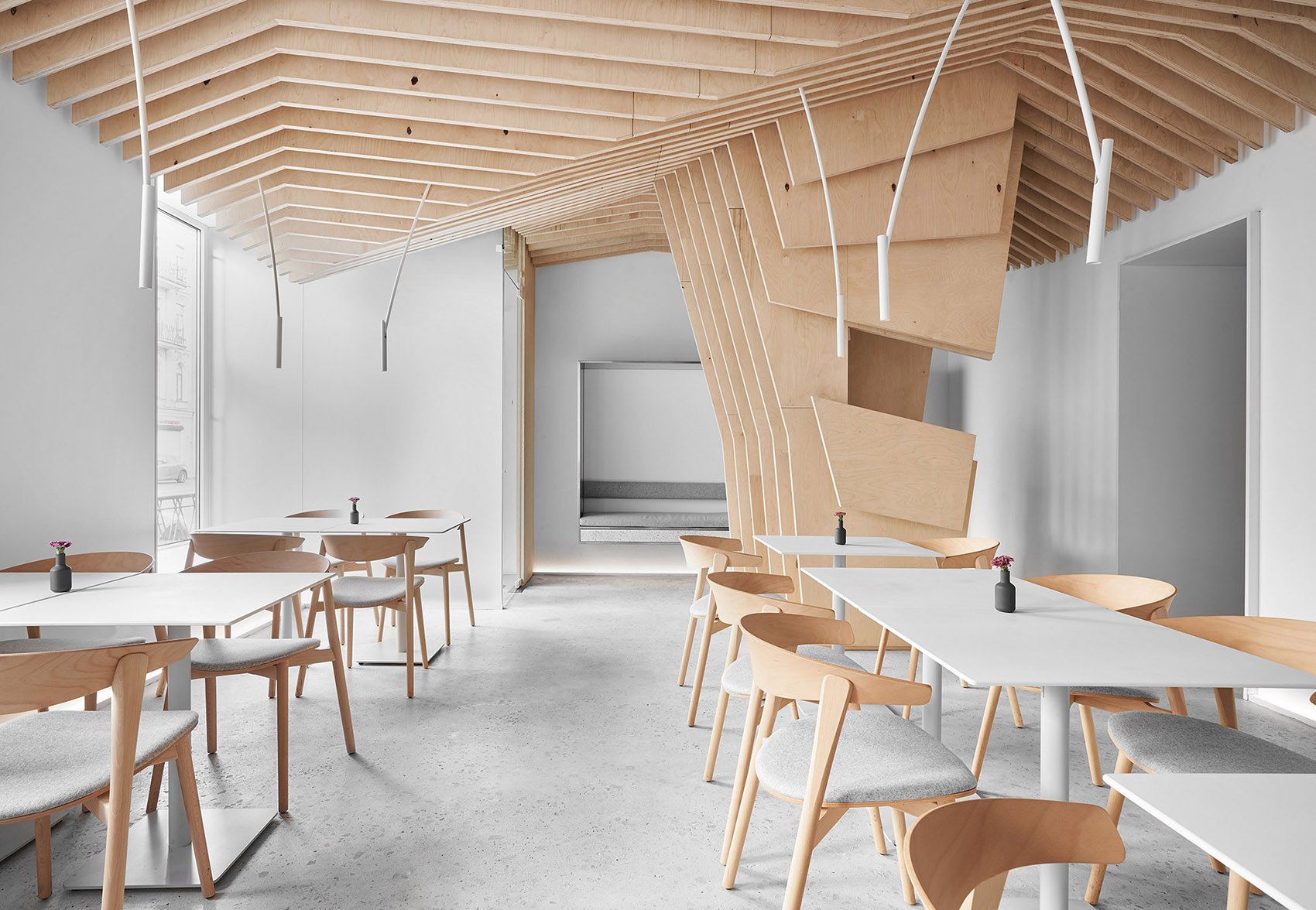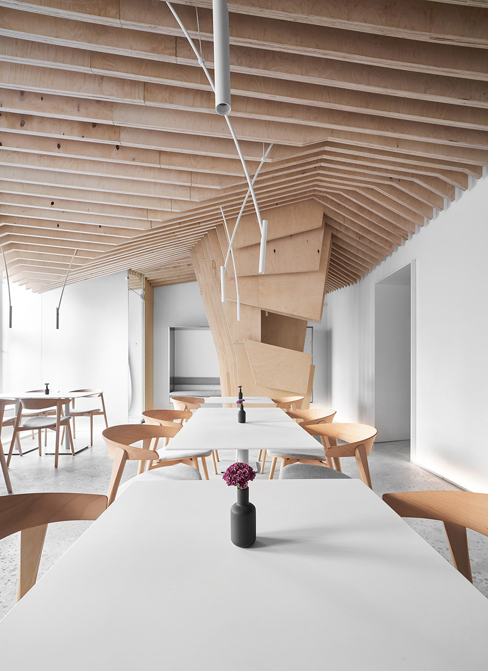 作为视觉的参照,设计结合了日本和斯堪的纳维亚的极简主义。设计者想要做出极度干净和简约的设计,以此将视觉重点聚焦在食物上而不是在装潢上——这是为什么空间的墙面都被粉刷成了白色、所有功能性元素都是由不锈钢制作而成、定制的桌子和白色的餐具,都在强调餐厅的餐品。