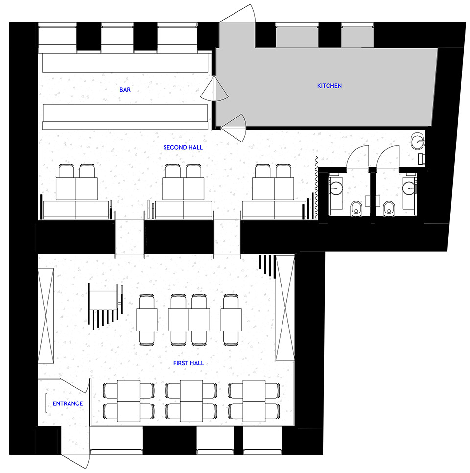 As a visual reference, we took a combination of Japanese and Scandinavian minimalism. We wanted to make really clean and simple design, that would help to make the main focus on food, not on the decor – that’s why the entire walls are just painted white, all the functional elements are made of stainless steel, custom-made tables with white tabletops emphasizes dishes of this place.