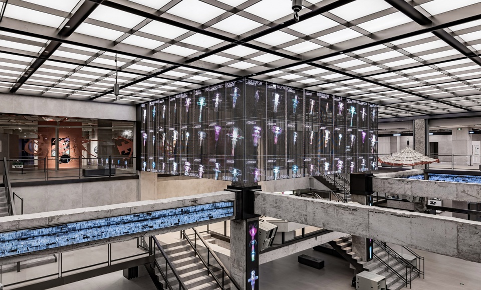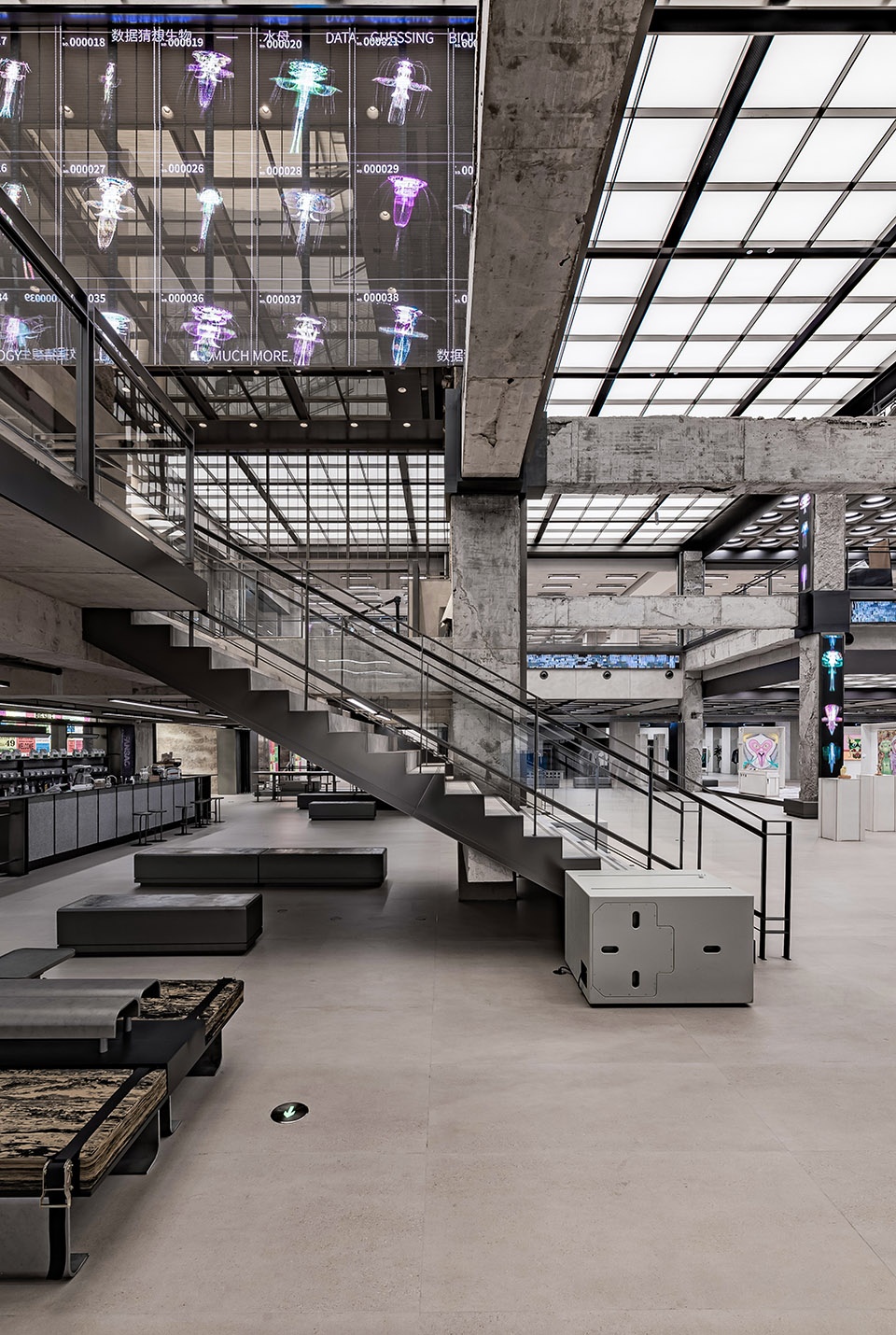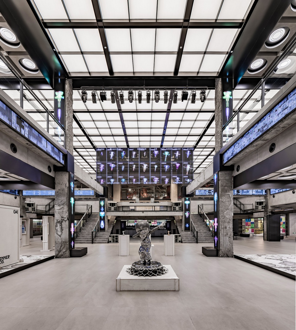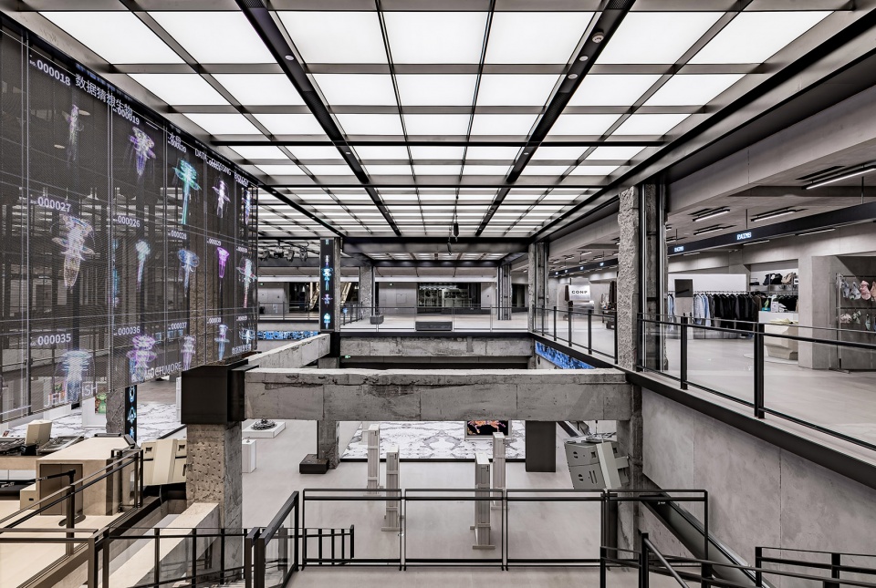 INNERCO是COSMO最大的亮点空间,占据了二、三楼共7600m²的空间。该区域保留了裸露的混凝土建筑结构,融合现代设计元素,与LED幻彩天幕的结合形成了一种历史性与未来感的碰撞。