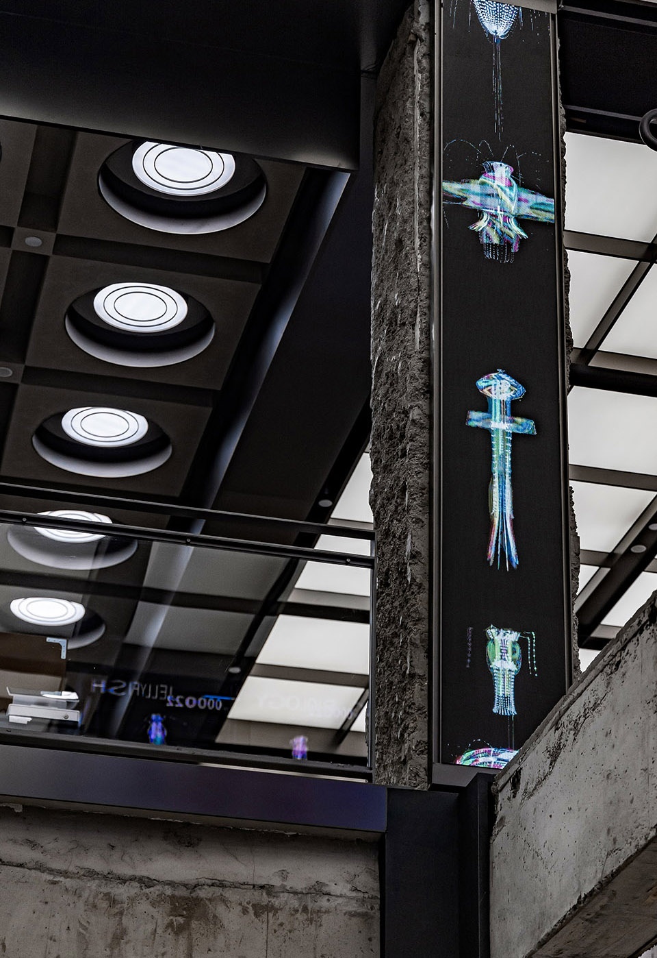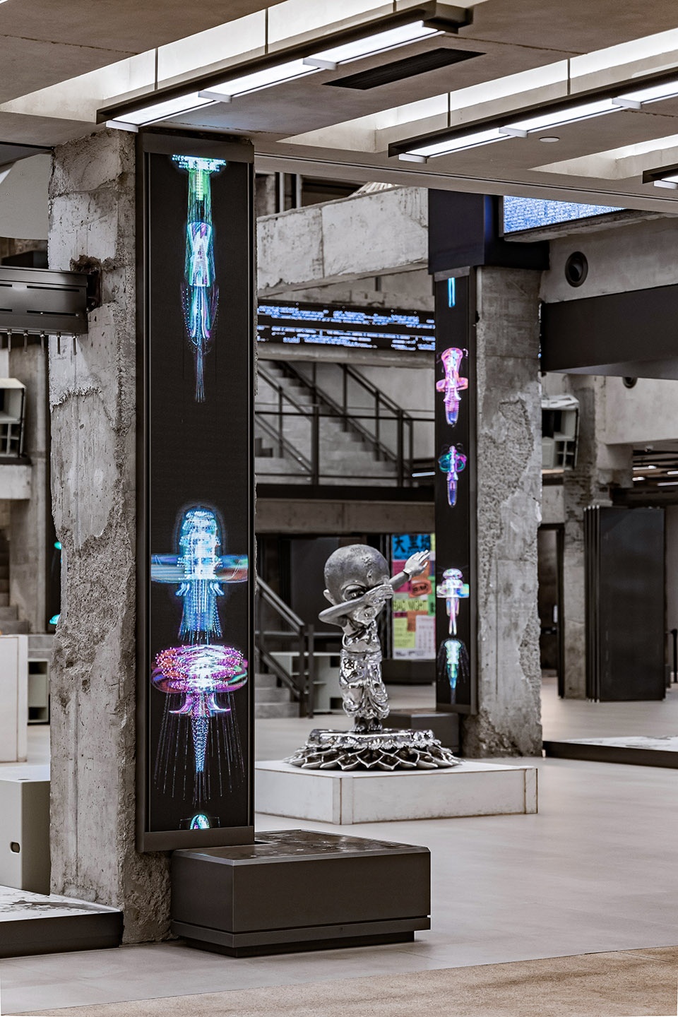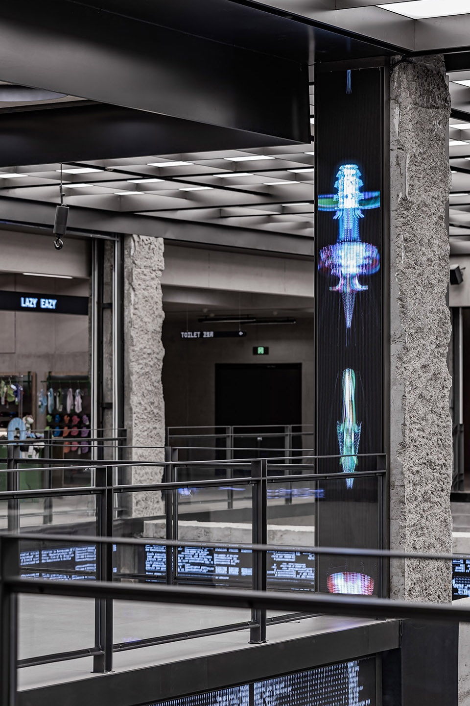 INNERCO是COSMO最大的亮点空间,占据了二、三楼共7600m²的空间。该区域保留了裸露的混凝土建筑结构,融合现代设计元素,与LED幻彩天幕的结合形成了一种历史性与未来感的碰撞。