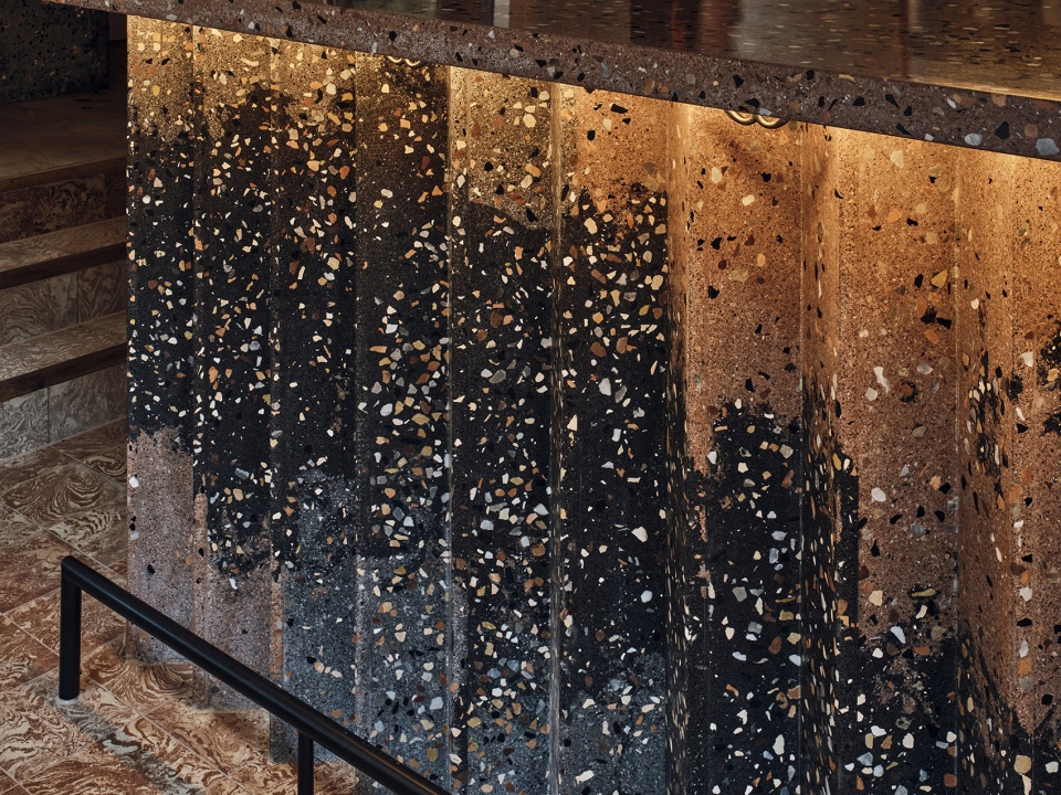 ▼吧台的锯齿状台身采用了独特的水磨石,The sculptural showstopper has an eye catching zigzag shape