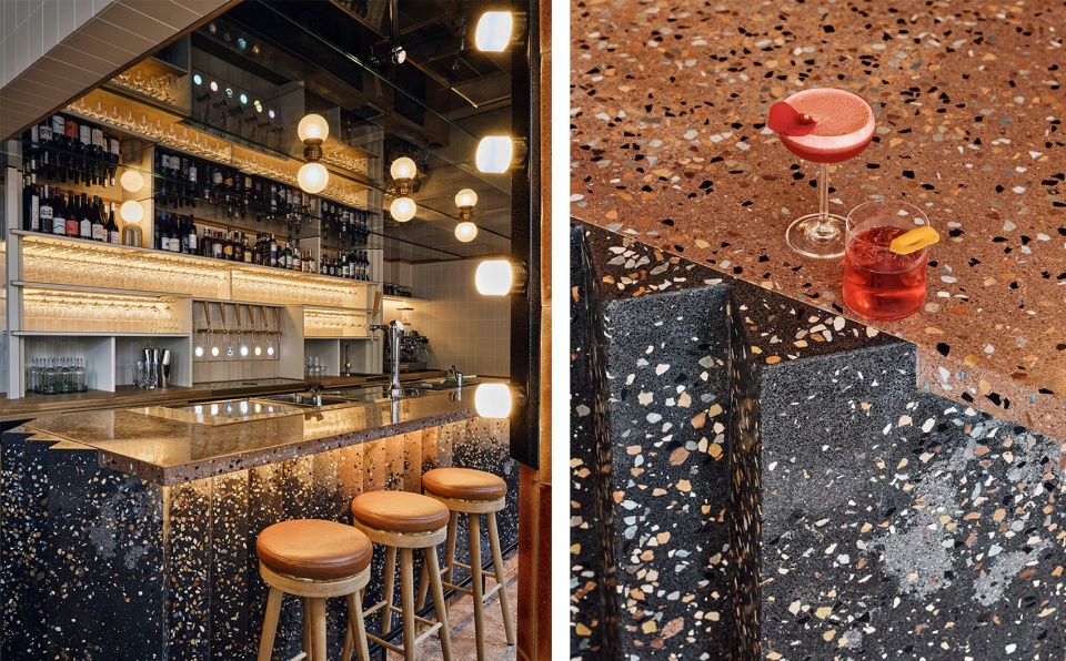 从首层走下两级台阶,便来到了酒吧区域。吧台的锯齿状台身采用了独特的水磨石,混合着灰色和粉色,雕塑般的造型十分引人注目。后方吧台沿着天花板的几何形状在后墙上对称地展开。酒吧一端设有大冰箱,为客人提供精心挑选的天然葡萄酒;另一端是厨房,将内部的烹饪过程直接地展现在人们眼前。