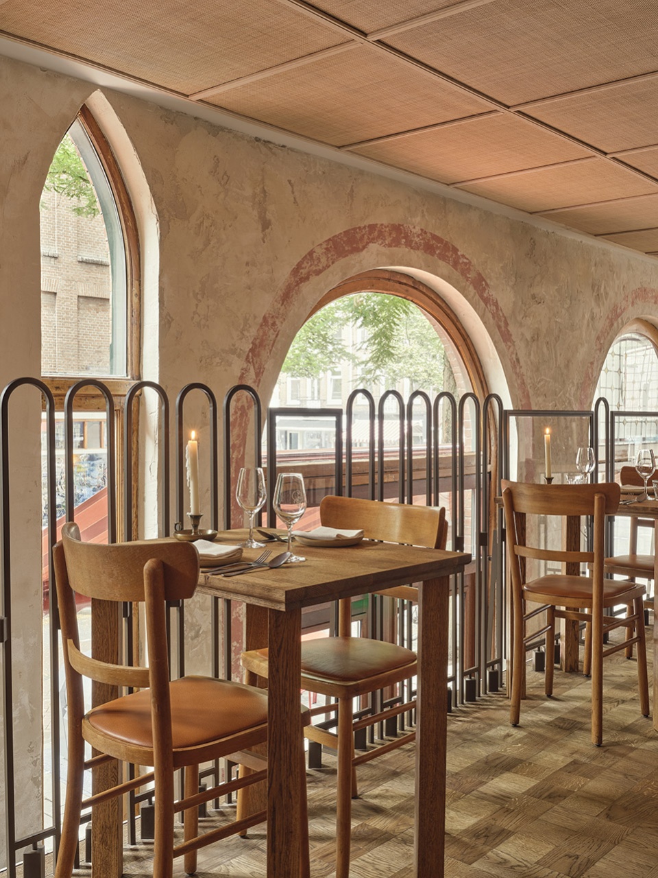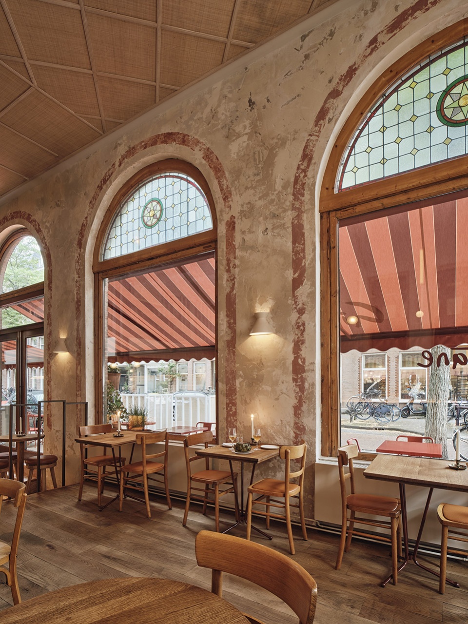 A rattan ceiling with a spectacular geometric pattern of slats unites the ground floor and mezzanine, which you climb up to via an original wooden staircase. Large windows next to the steps define the position of the glass partitions of the mezzanine railing, subtly bringing the facade indoors while extending the visual lines from the street to the interior.
