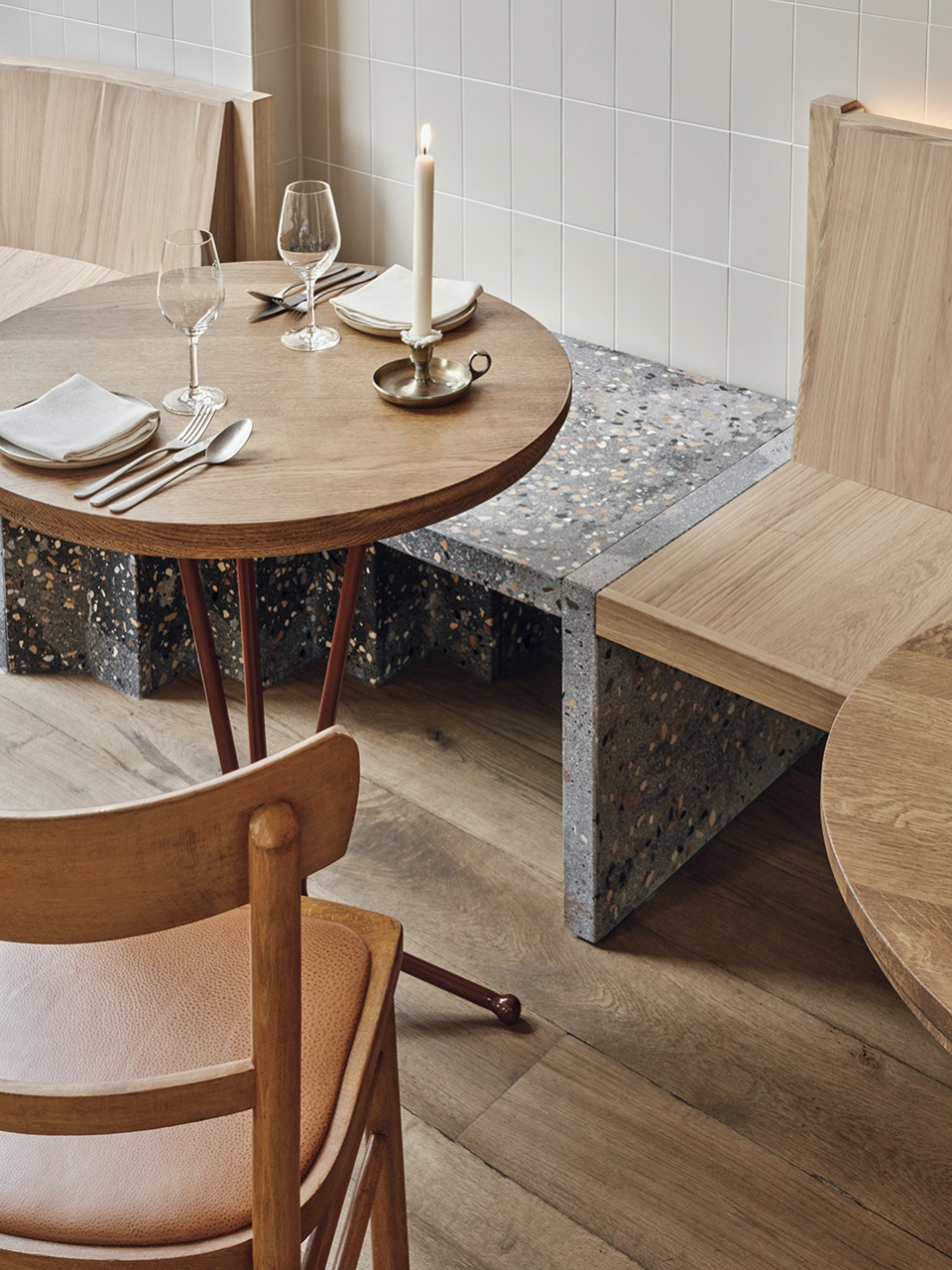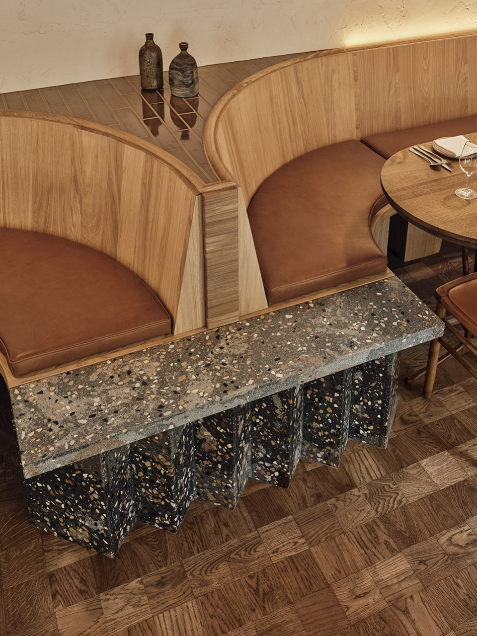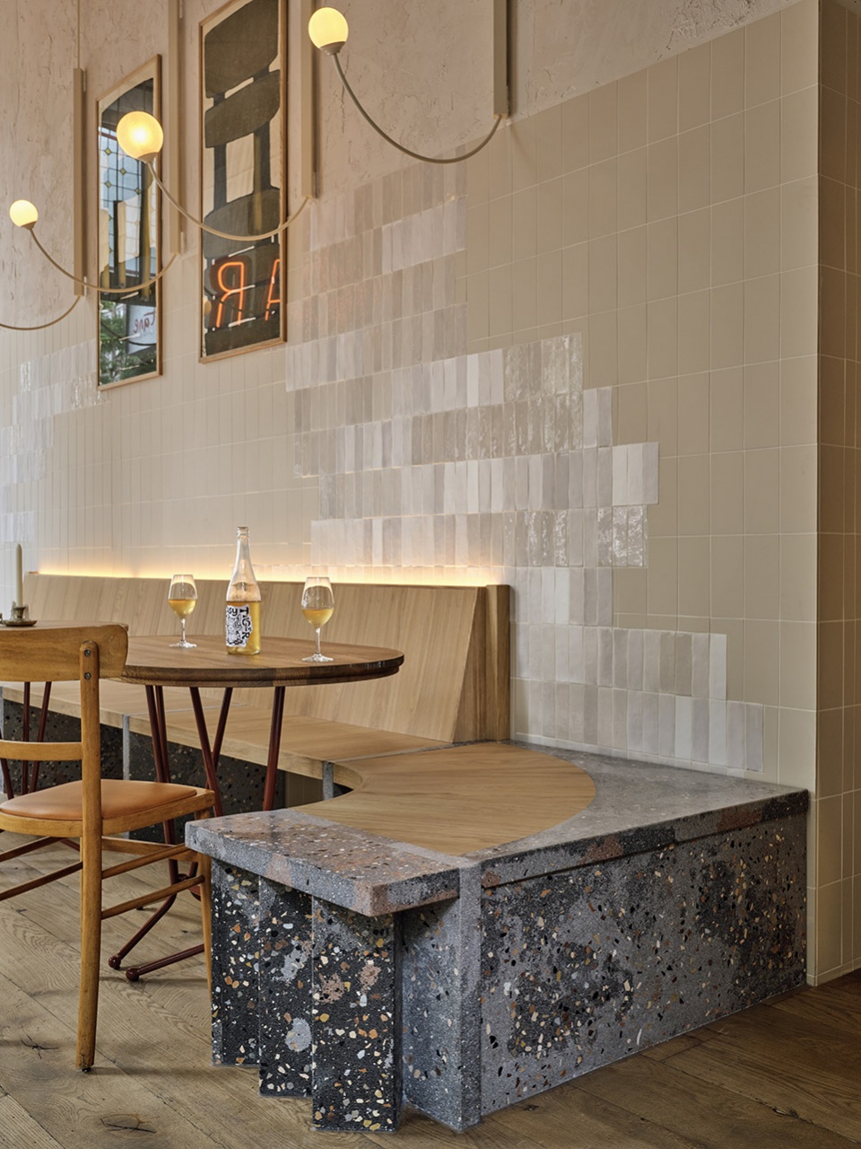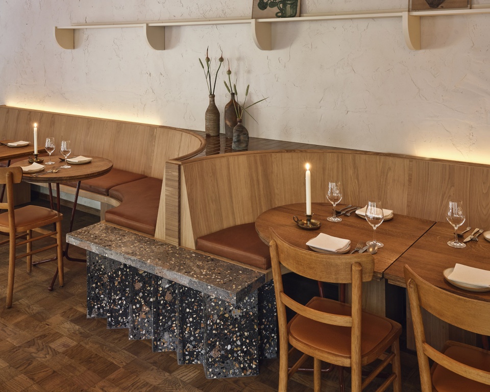 Two steps down from the ground floor you’ll find the bar. It’s a sculptural showstopper in an eye catching zigzag shape, made with a unique terrazzo mix of greys with pink accents. The back bar follows the ceiling geometry and develops symmetrically on the back wall. At one end a large fridge invites guests to peruse the carefully curated assortment of natural wines, while at the other they can get a glimpse of what’s cooking in the kitchen.