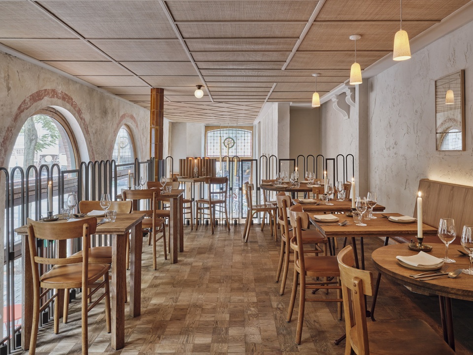 温暖的光线与木质装饰为首层空间奠定了基调。在这里,人们将被古典风格和定制的木制家具围绕。抽象的白色瓷砖墙与浅色的粗糙粉刷形成有趣的对比。在首层的另一侧,高大的拱形窗户旁边摆放着小桌,提供了一个更加私密的环境。背景处的墙面经过了风化处理,凹凸的纹理看上去犹如漂浮着的米色云彩。
