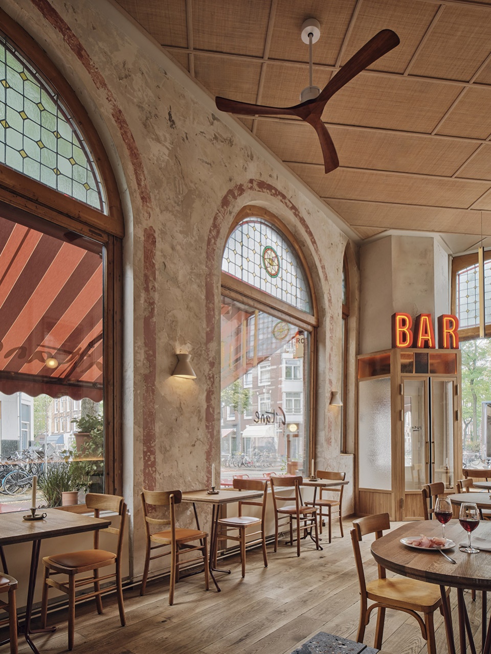 The main entrance is through a wooden vestibule with coloured glass. It brings you into the double-height restaurant space, over which large dark orange neon letters spelling ‘BAR spread a warm glow from the top of the vestibule.