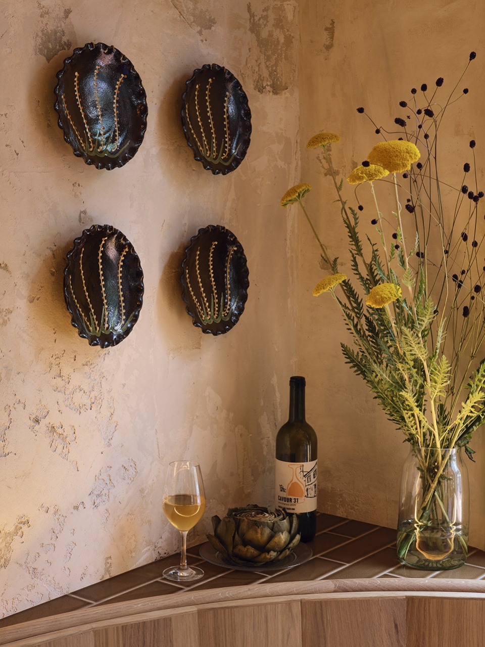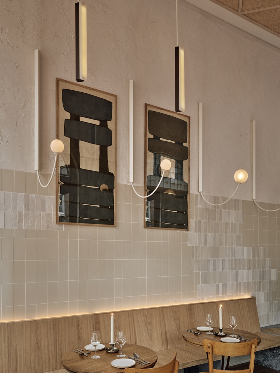 The warmth of the light and the wood of the vestibule set the tone for the ground floor. You’re surrounded by classic and custom wooden furniture. This side hosts an abstract tiled landscape where lightly coloured rough stucco meets a pattern of white tiles. On the opposite side of the ground floor small tables offer a more intimate setting next to tall arched windows. The background has been given a weathered appearance, and clouds of different beiges mix and match across the length of the wall.