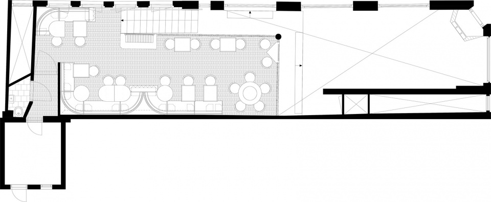由板条构成的藤制天花板将首层和夹层连接在一起。客人可以经由原木材质的楼梯到达该层。夹层围栏的玻璃隔段根据台阶旁的大窗户确定出位置,巧妙地将立面融入室内环境,同时也将视觉线条从街道延伸至内部。