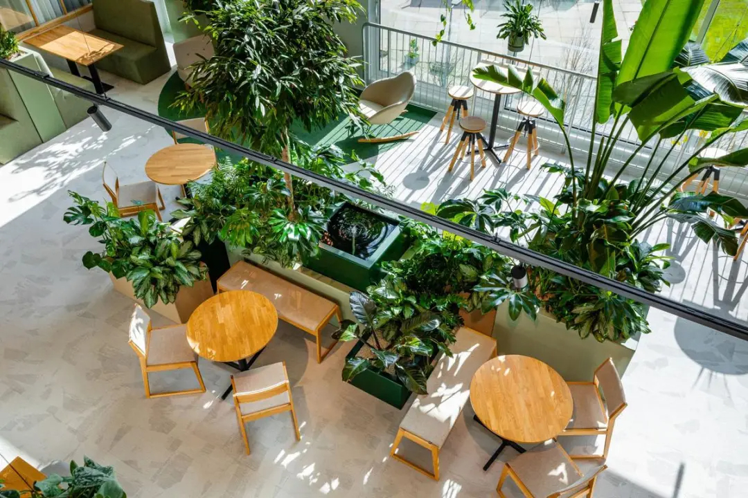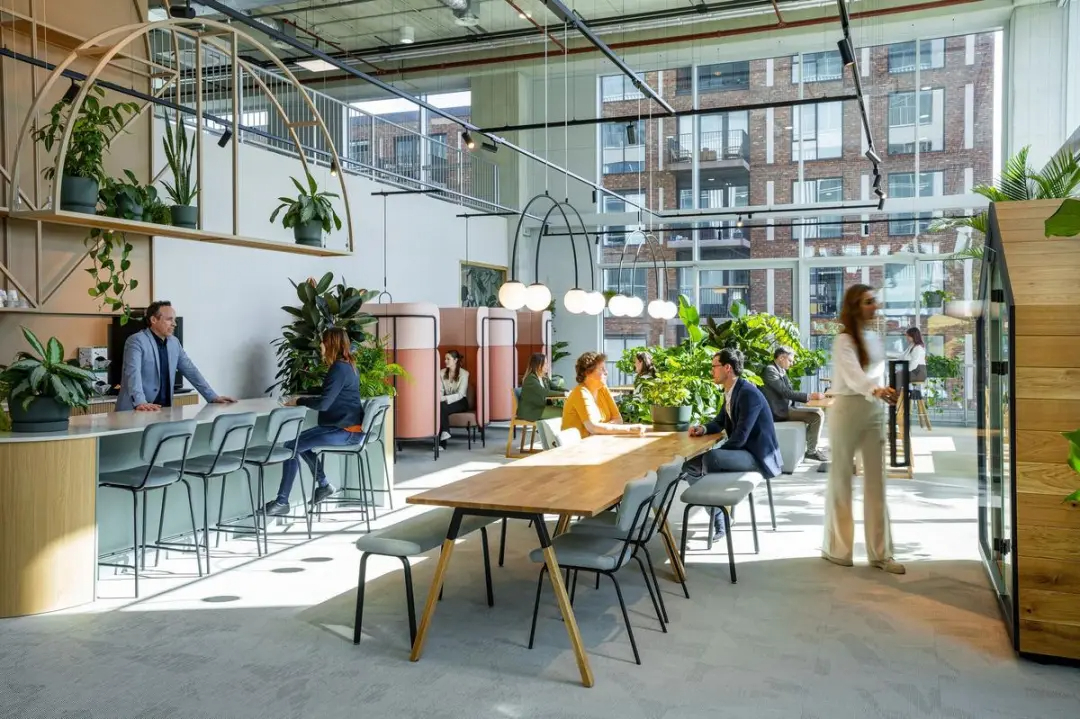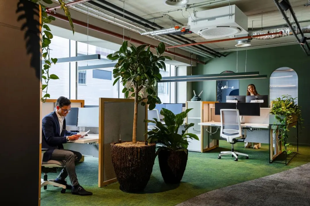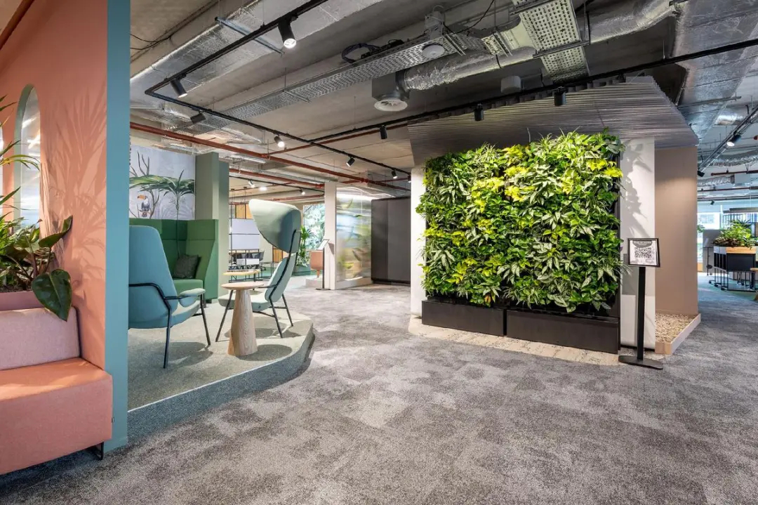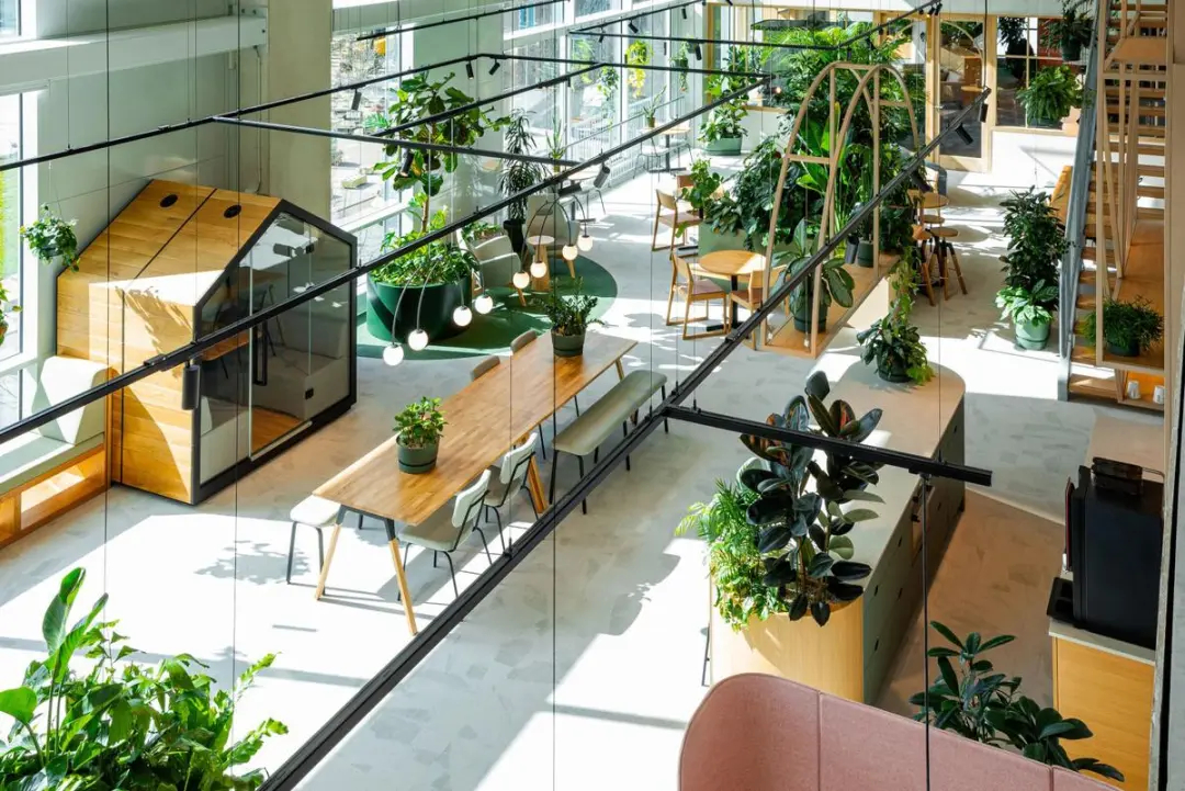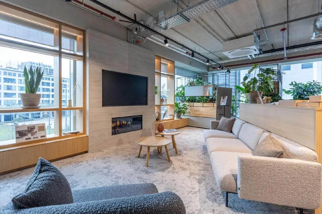 开放式工作区以自然景观为灵感,谷地区设有厨房和餐吧式布局,促进交流;涌泉区以流水幕墙为视觉焦点,令人静心凝神。每个工作区都有专属功能与命名,“三角洲区”设有钢制书柜,“水沼区”设有靠岸平台和声学波浪长椅,“森林区”则以墨绿地毯、繁茂绿植等营造舒适办公氛围。