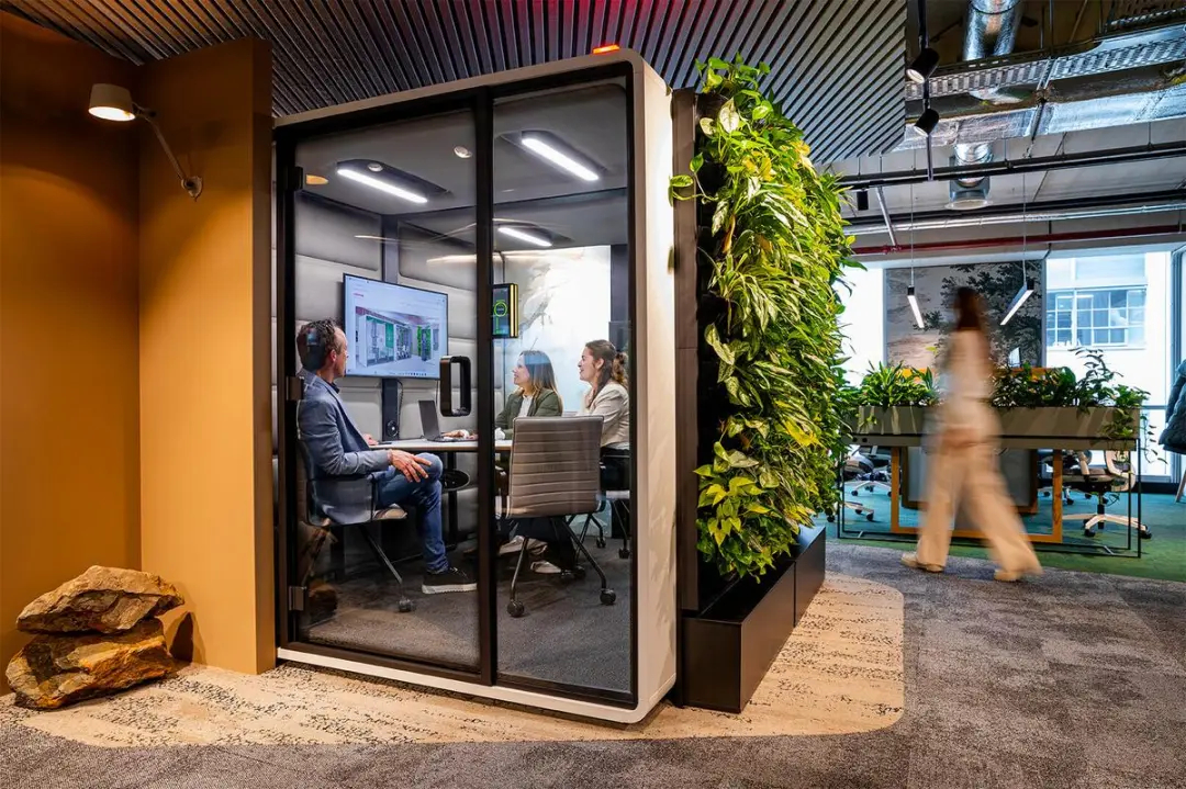 展厅采用全开放式布局,通过巧妙墙体布局界定功能分区。核心区域错落布置着多间Mikomax品牌的Hush系列声学舱,满足通话、洽谈和专注工作需求。最大号的Hush舱设计成洞穴风格,营造出宁静体验。沿街立面还打造了绿植休憩舱,提供放松身心、重焕活力的契机。
