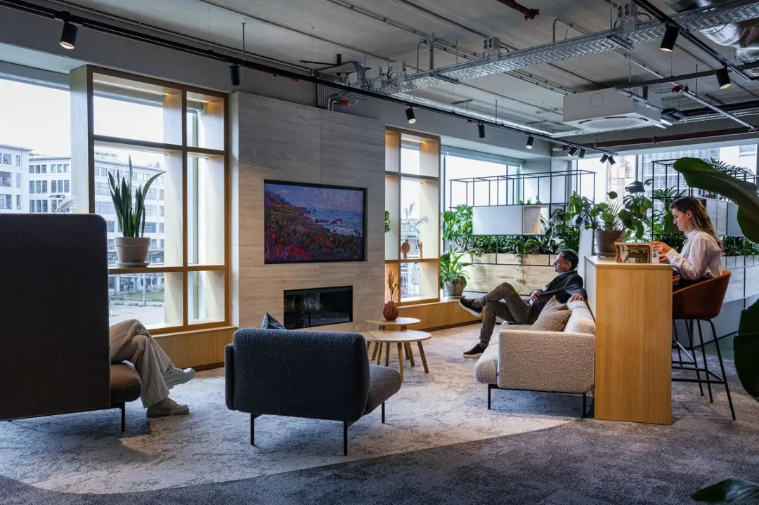 “围炉区”是对古老围炉传统的当代演绎,设置电子壁炉和大型显示屏,配备舒适沙发与扶手椅,形成非正式座谈区。设计师还提出创建“子空间”的解决方案,通过四面墙体构建不对称十字结构,打造专注于产品本身的沉浸式氛围角落。
