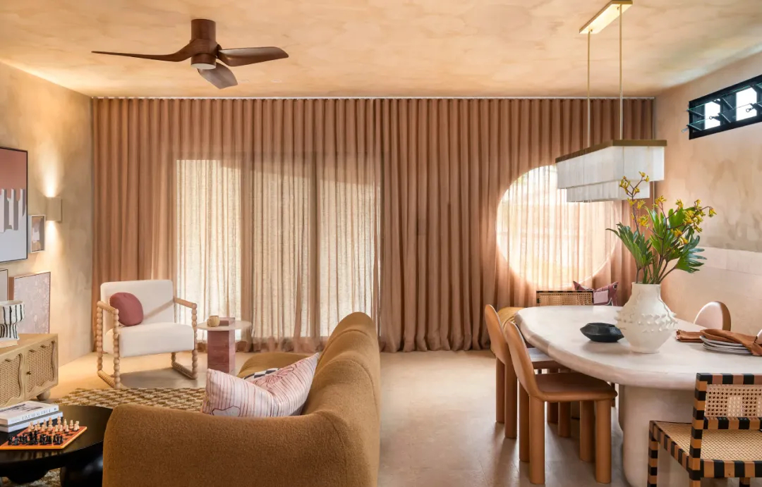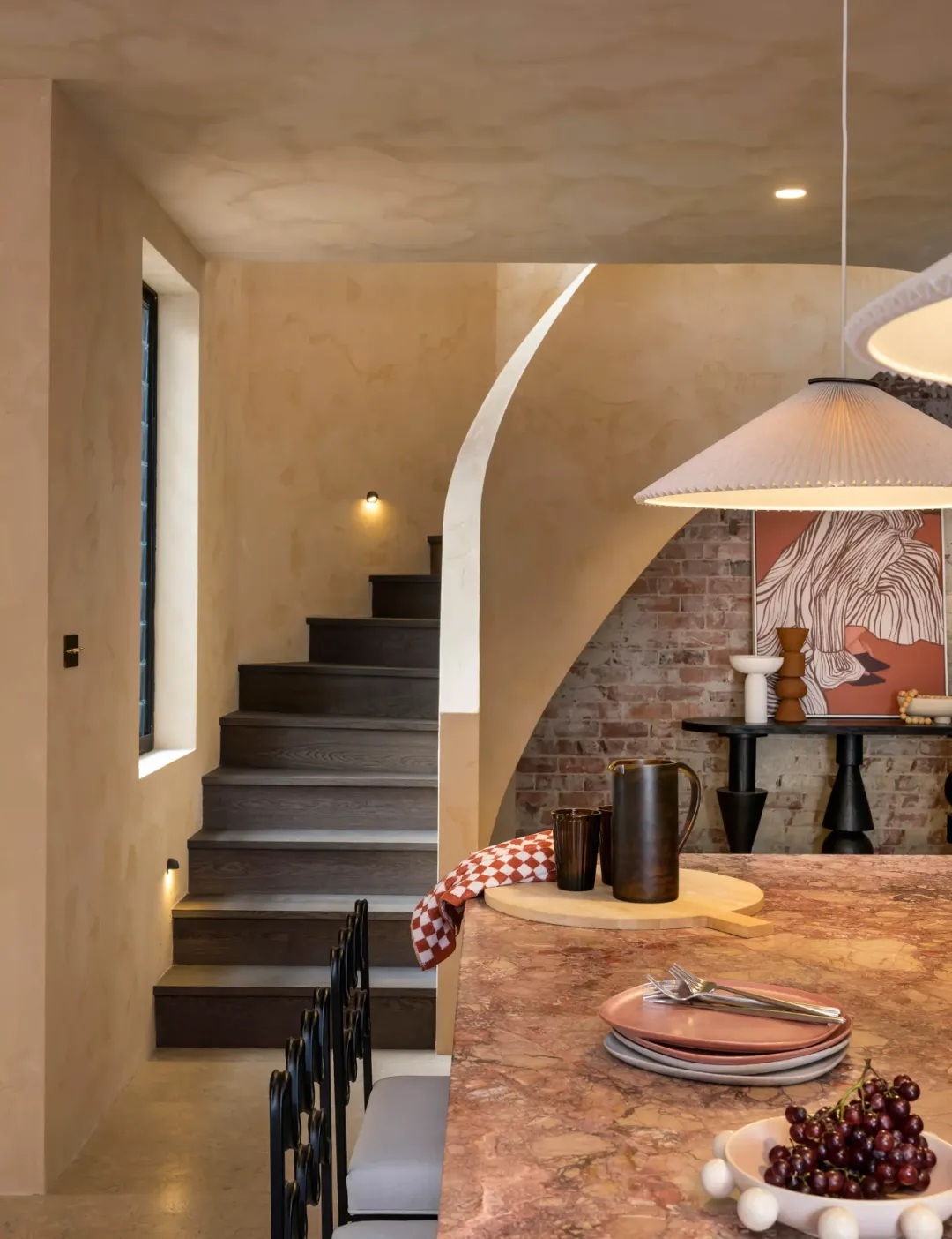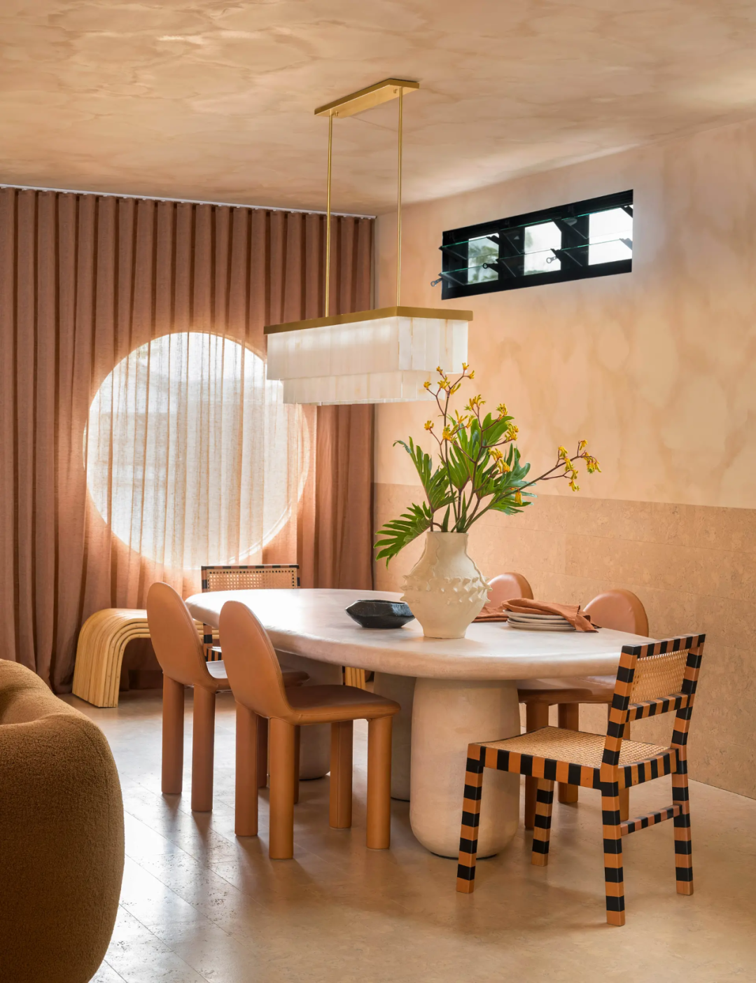 餐厅区域堪称“矛盾美学”的教科书。ELLISON STUDIOS的拱形皮革餐椅环绕实木长桌,皮革的细腻与木材的肌理形成戏剧化对比。