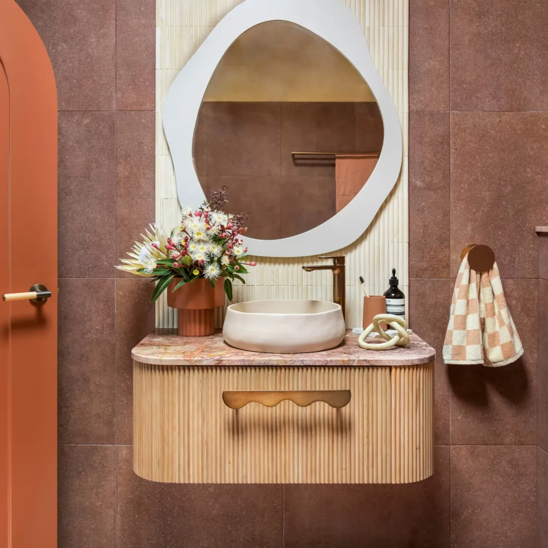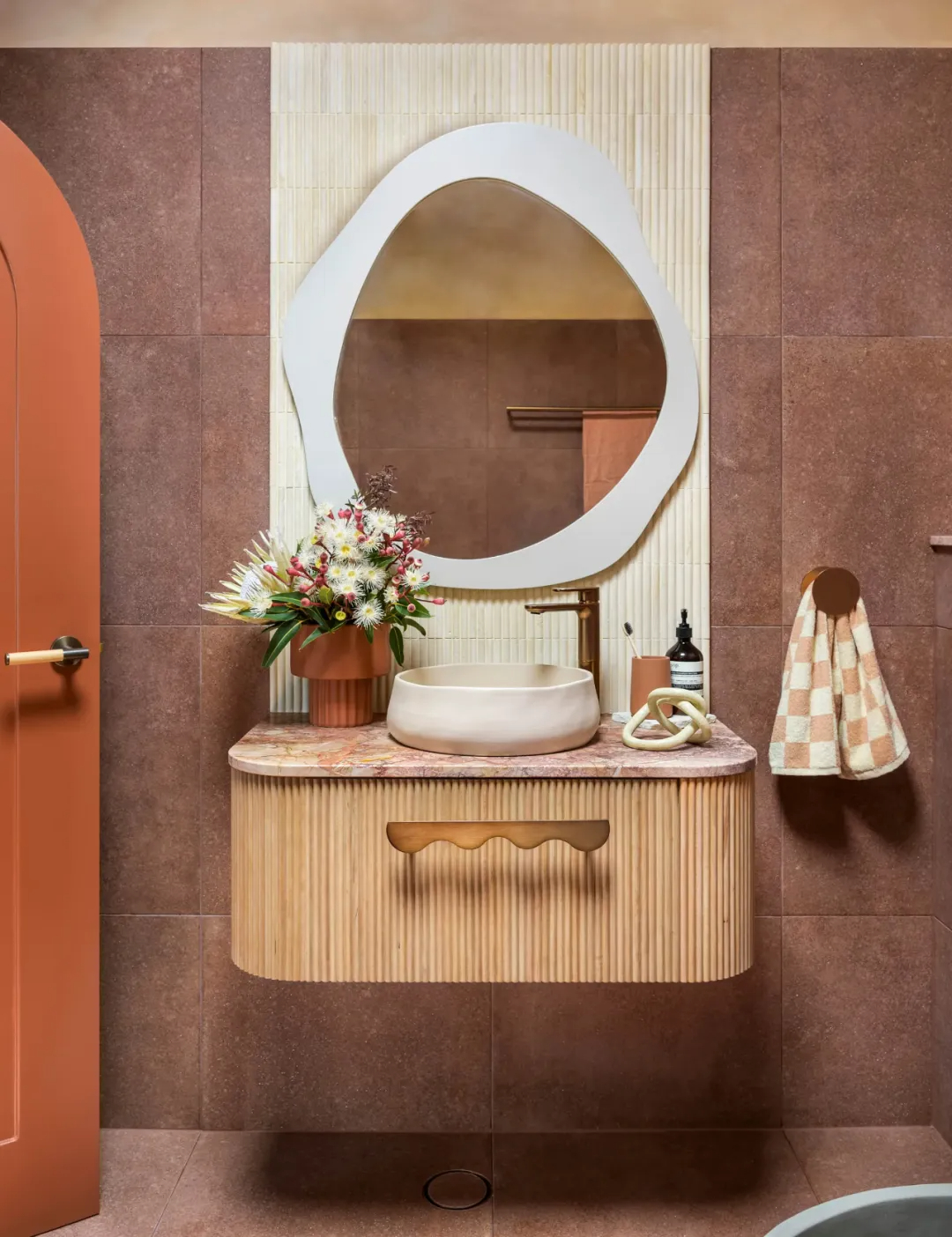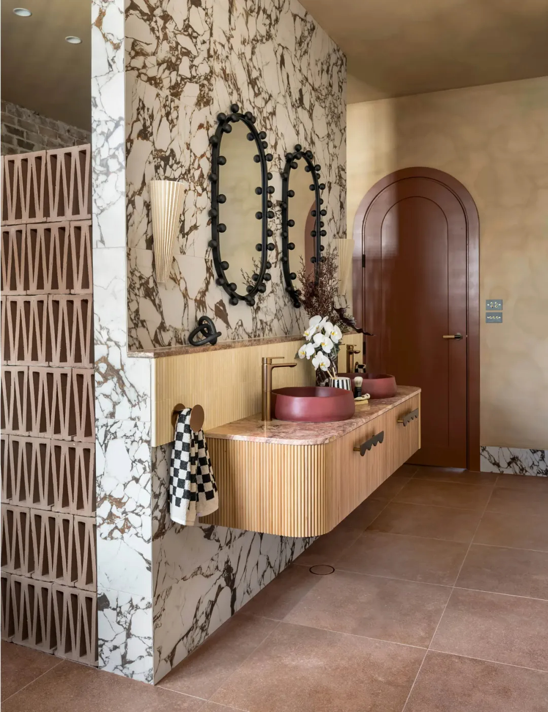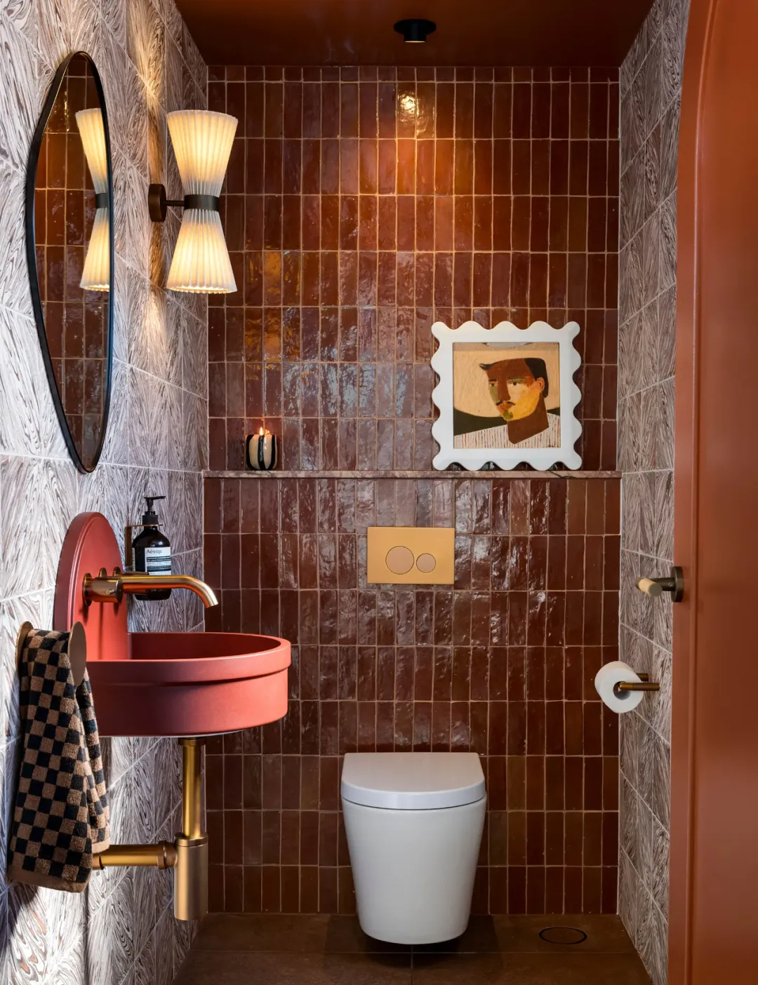 卫生间堪称全屋最大反转!墙面通铺暗红色釉面瓷砖,氤氲出复古而忧郁的氛围。