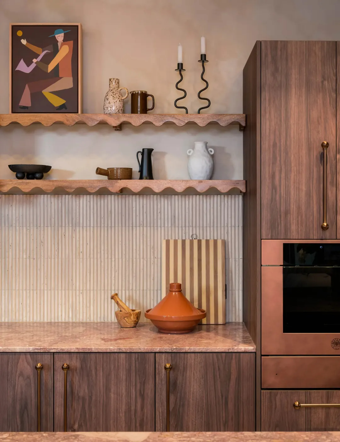 深胡桃木橱柜搭配哑光黑五金件,宛如低调的指挥家,将实用性与高级感完美调和。谁说厨房不能是家里的C位?