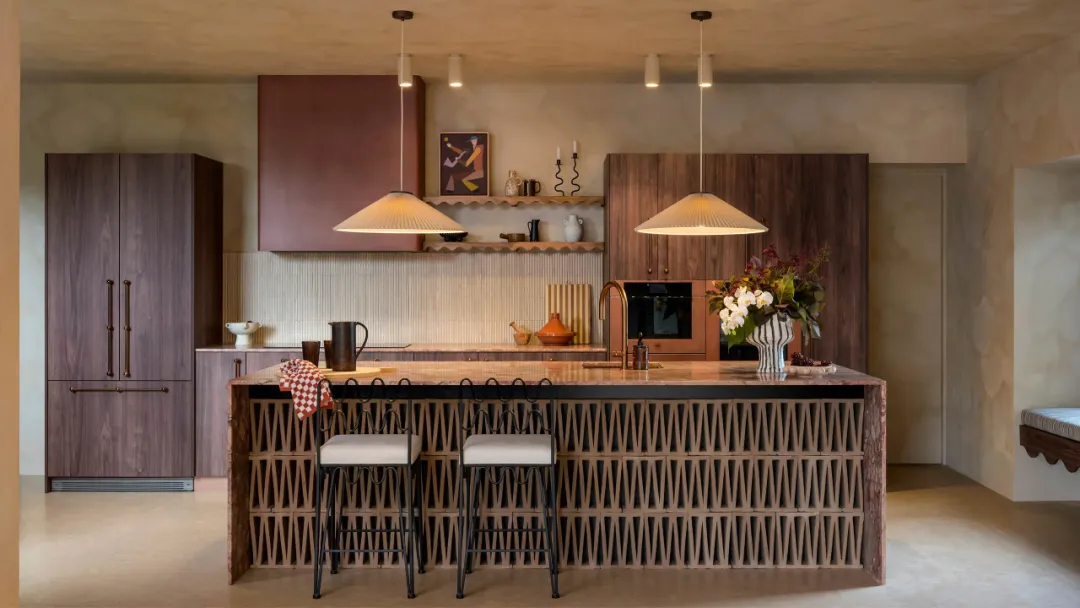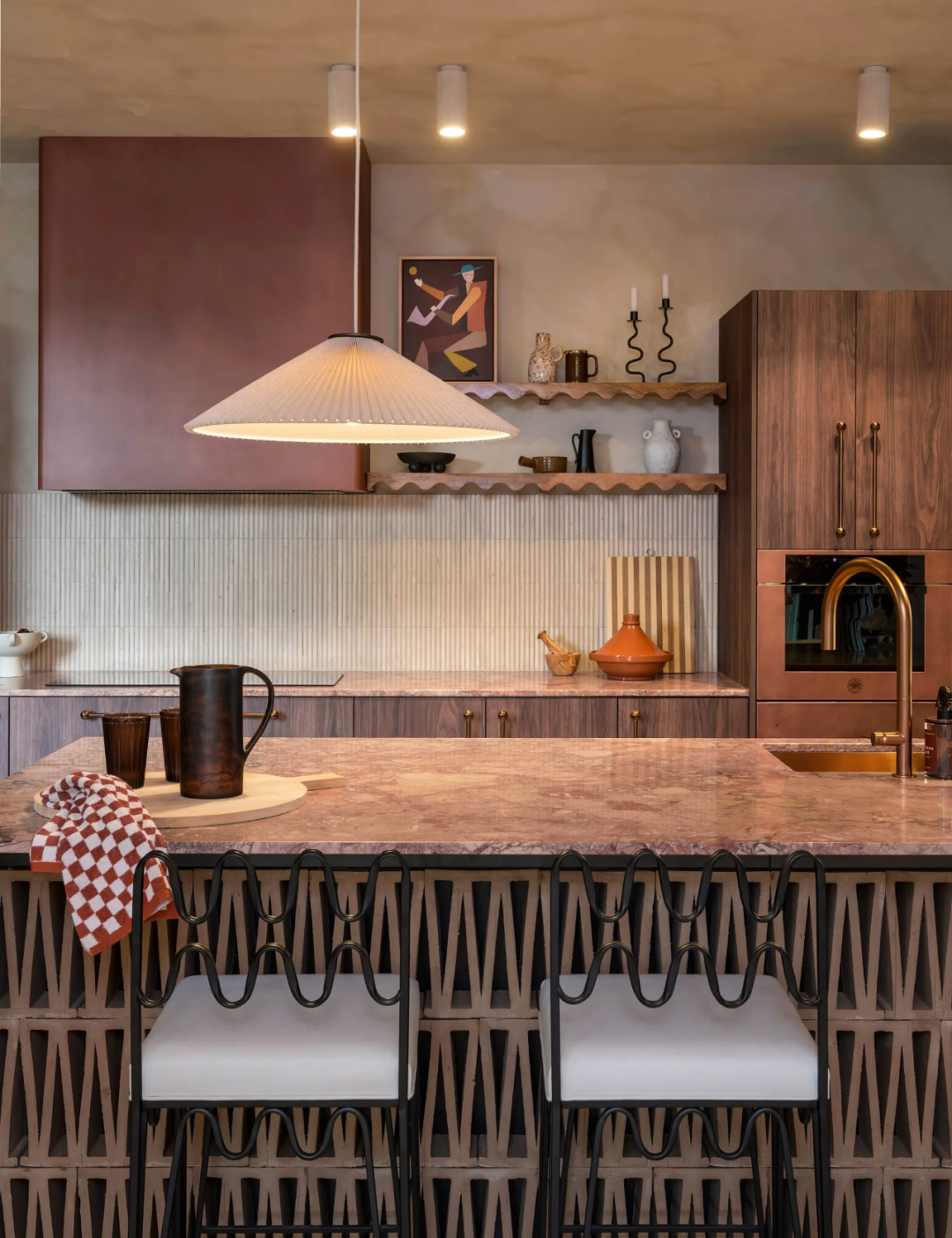 厨房岛台堪称全屋最大胆的设计!酒红色花岗岩台面如凝固的岩浆,下方基座用陶土空心砌块堆砌,粗粝质感与光滑台面形成奇妙反差。