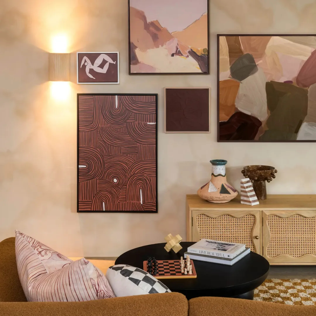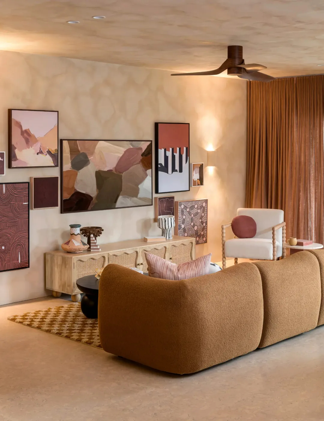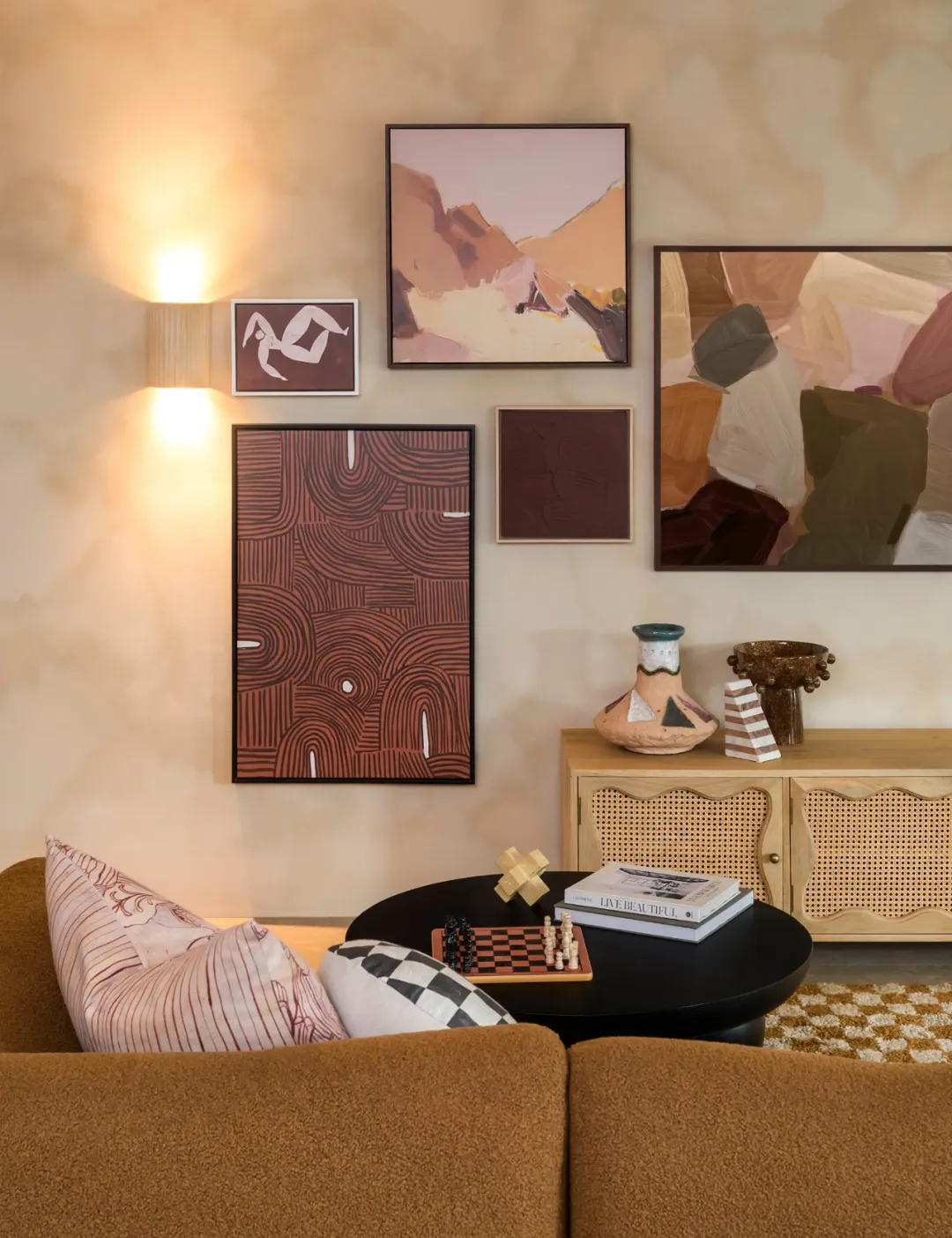 酒红色墙面与胡桃木柜体碰撞出微妙张力,仿佛一杯陈年红酒与爵士乐的邂逅。墙面上悬挂的澳大利亚限量版艺术画作,如同点睛之笔,让沉稳的基调瞬间跃动起来。