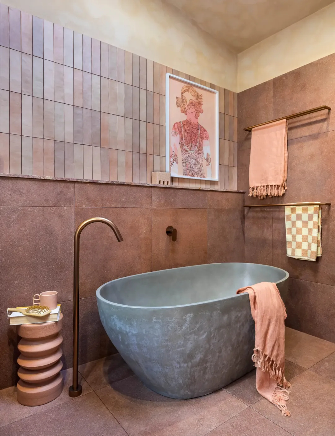 Highgrove Bathrooms的独立浴缸以铜质龙头点缀,金属光泽在暗调空间中划出优雅弧线,让日常洗漱变成沉浸式美学体验。