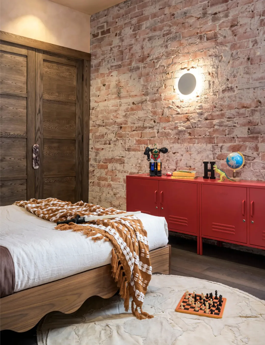 深色木地板从脚下蔓延,将人引入静谧之境。设计师特意保留部分裸露砖墙,搭配暖黄灯光与极简家具,粗犷工业风与卧室的柔软属性达成微妙共识。