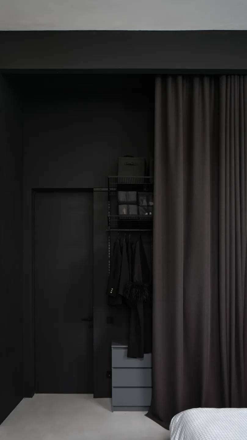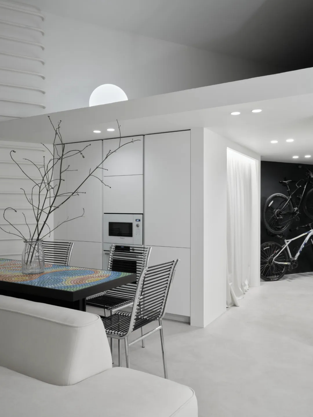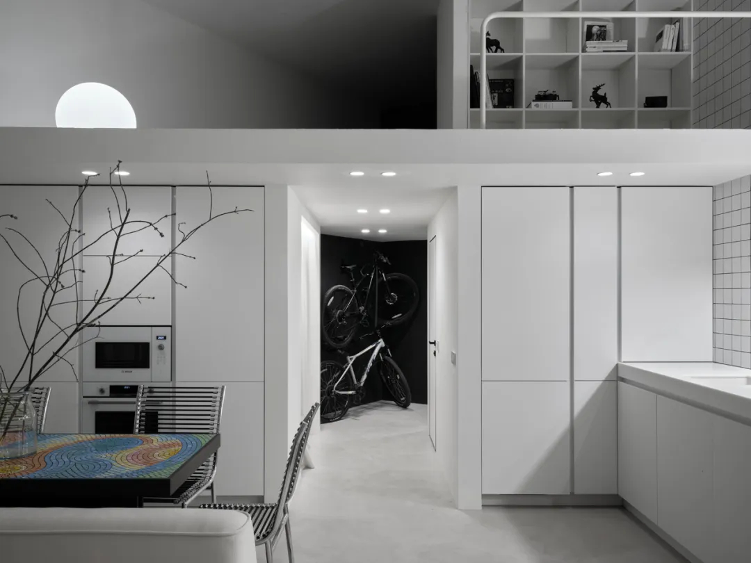 黑色墙面如艺术画布般展开,与极简线条形成戏剧性对比。设计师巧妙利用垂直空间,将自行车挂墙收纳,既解决功能性需求,又赋予入户场景独特的仪式感。