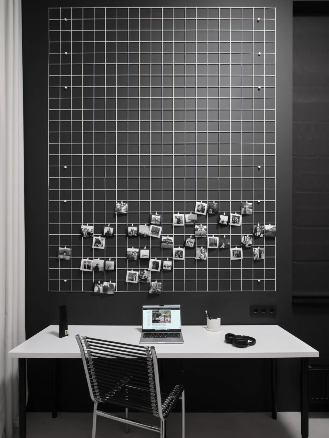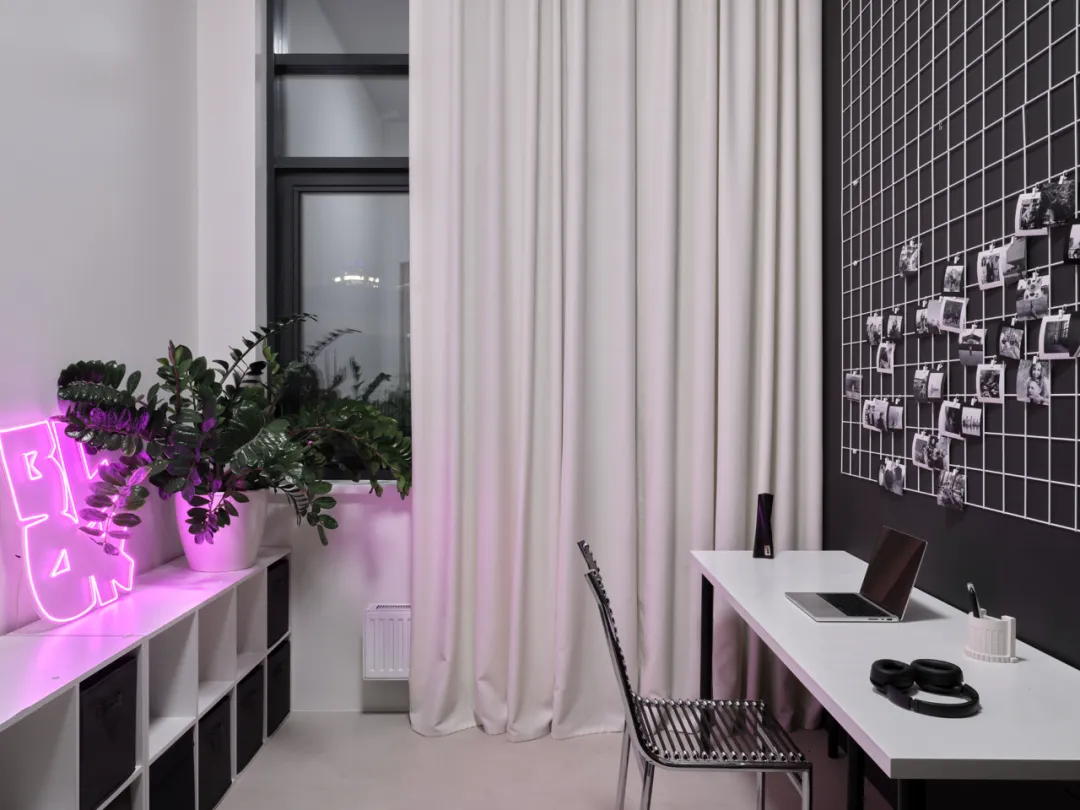 一黑一白墙面构成视觉张力,几何书桌呼应色彩对比。绿植与软装点缀打破单调,打造理性与感性交织的沉浸式工作空间。