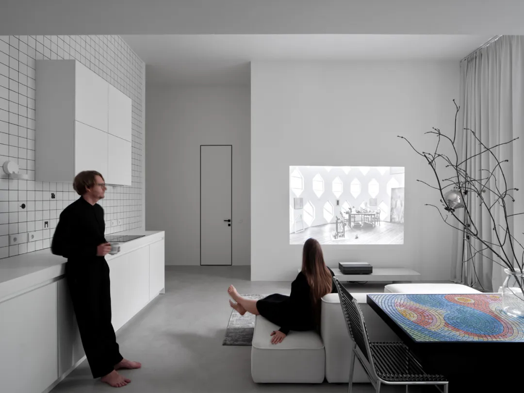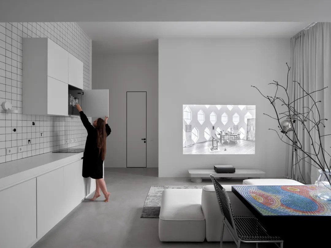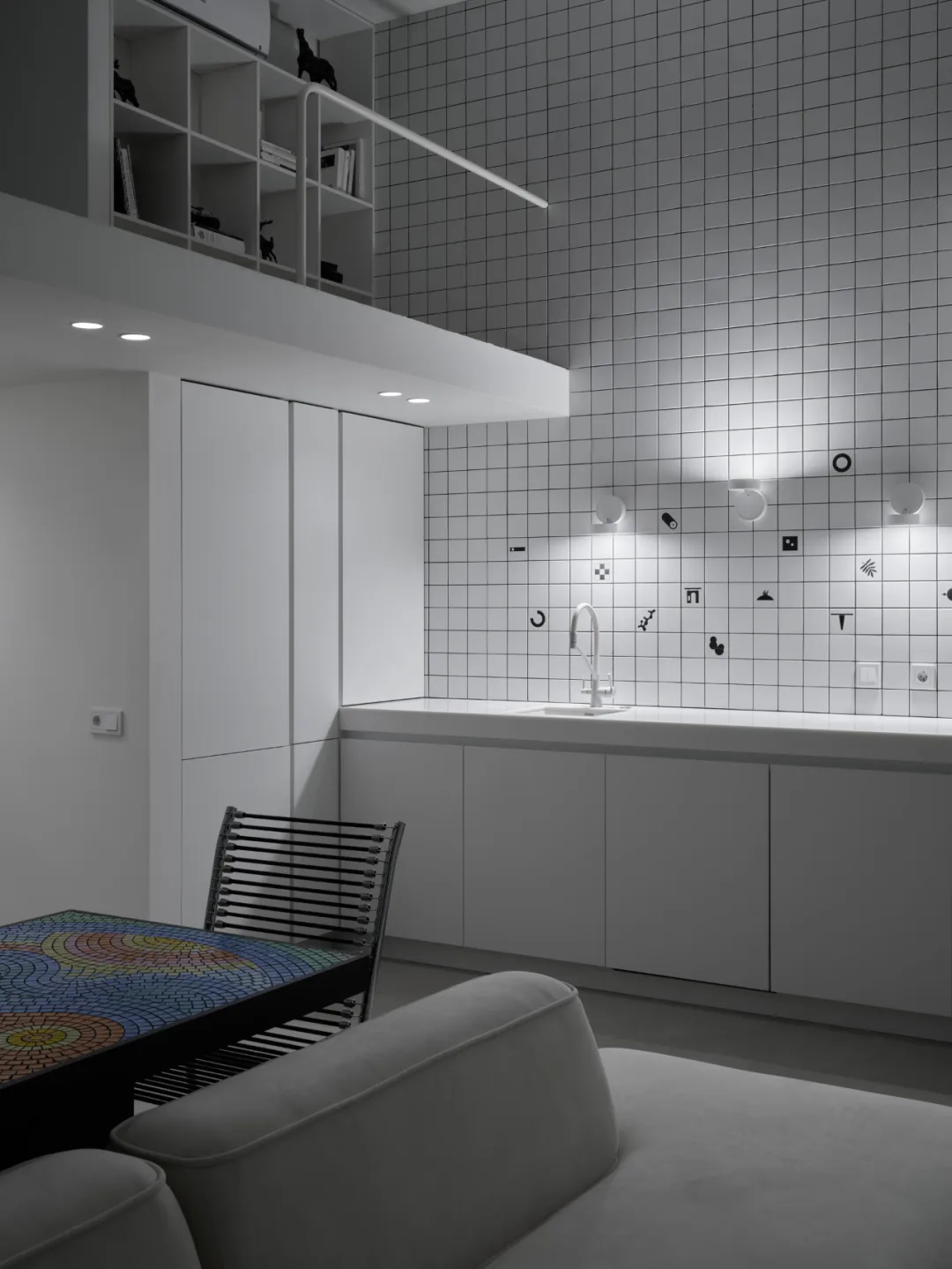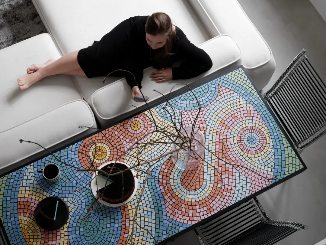 手工马赛克餐桌成为空间焦点,跳跃的纹理为极简基调注入灵动气息。