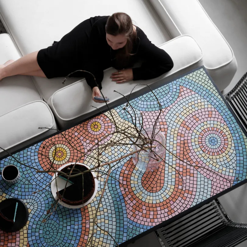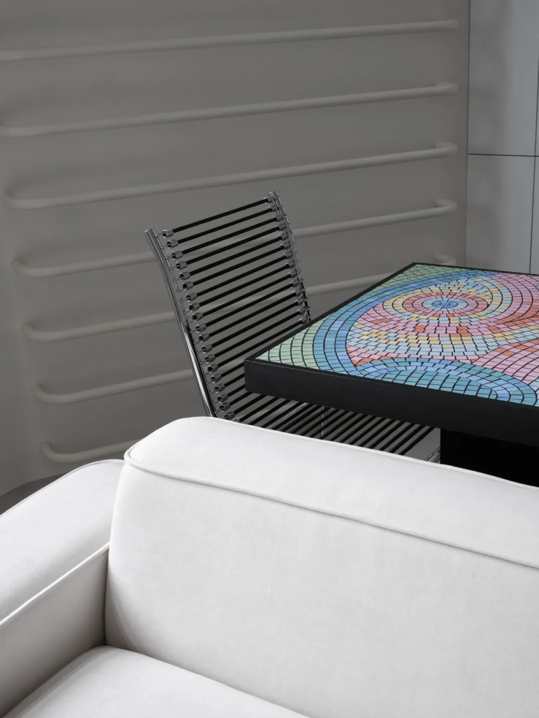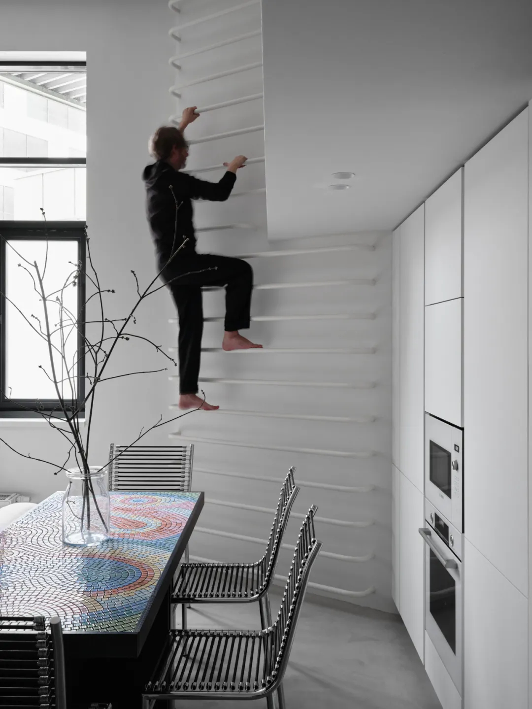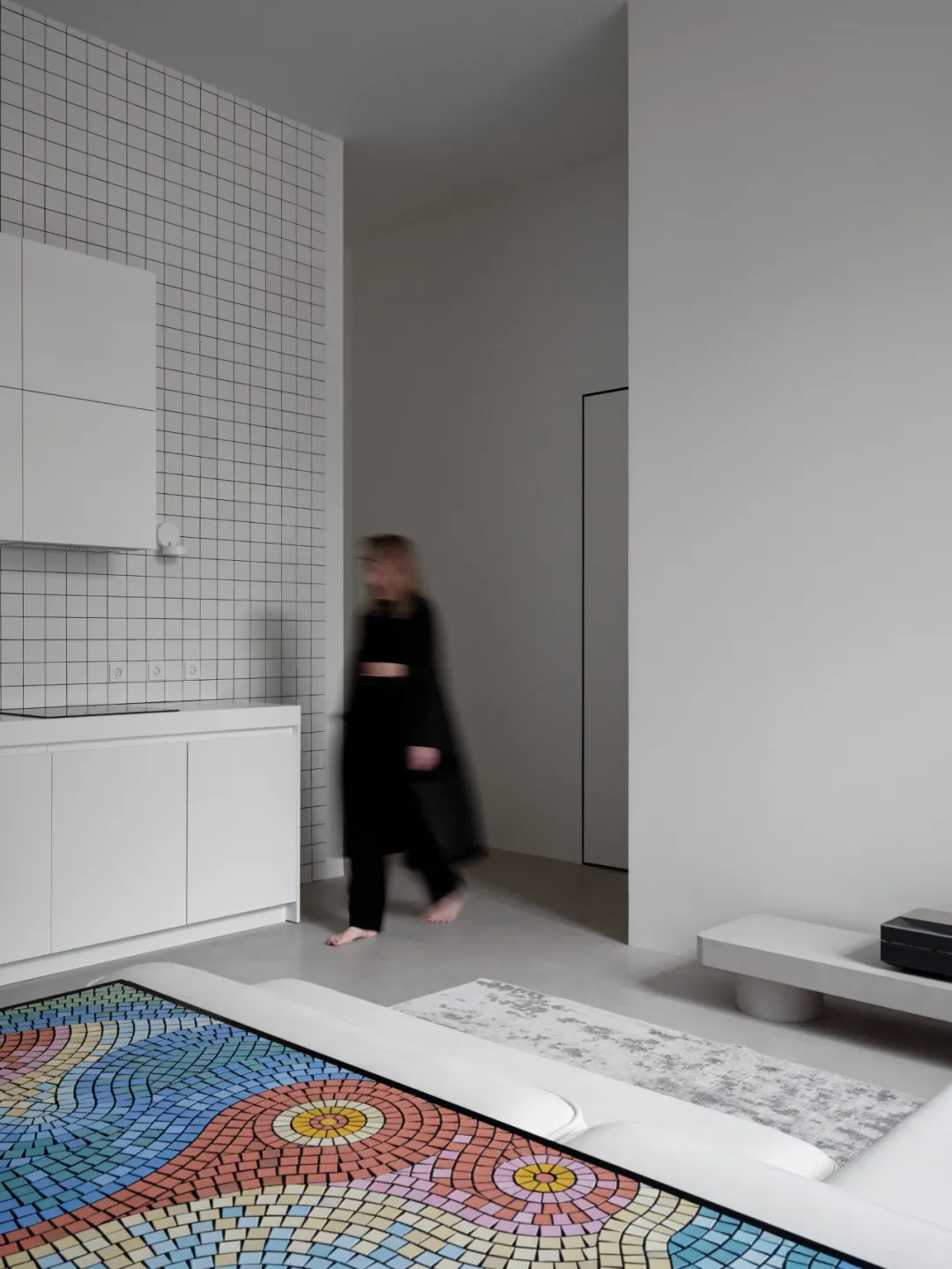 手工马赛克餐桌成为空间焦点,跳跃的纹理为极简基调注入灵动气息。
