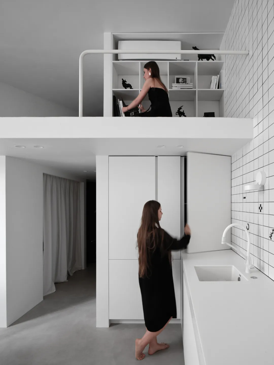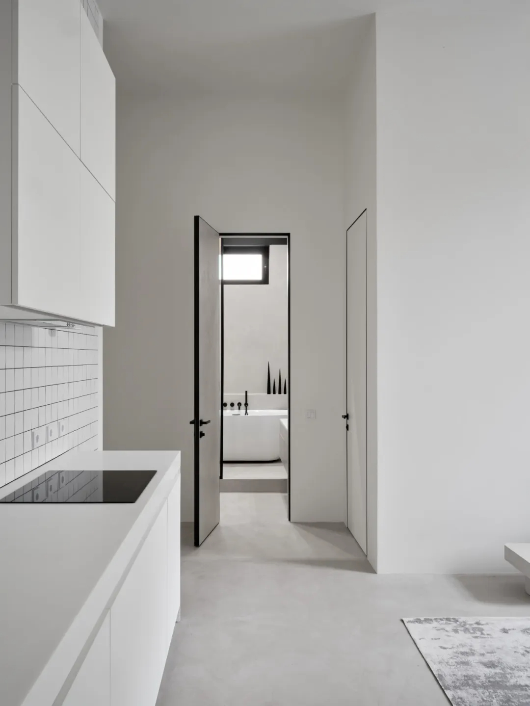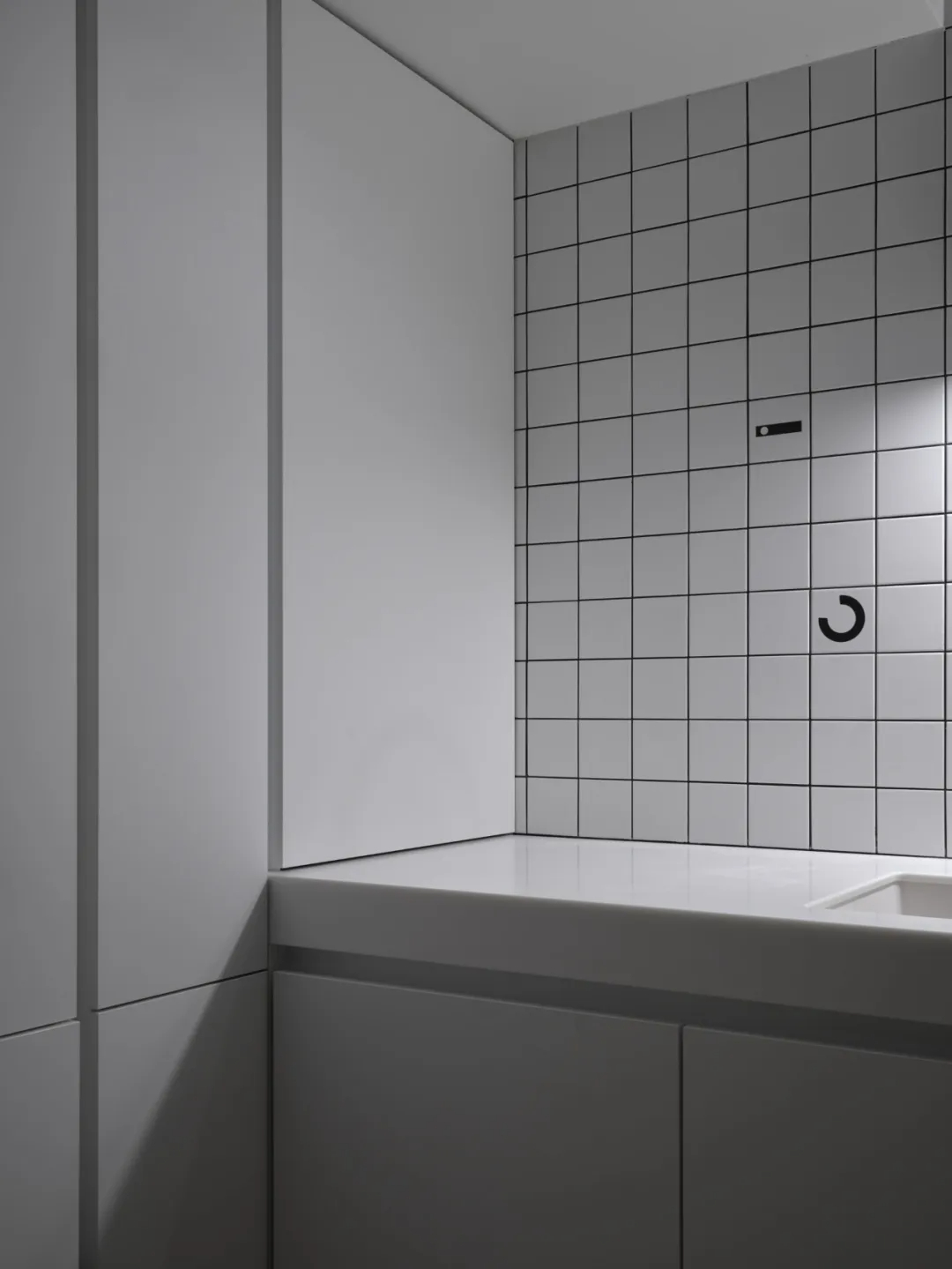 白色瓷砖墙面碰撞粗犷混凝土地面,模块化分区实现极致收纳。