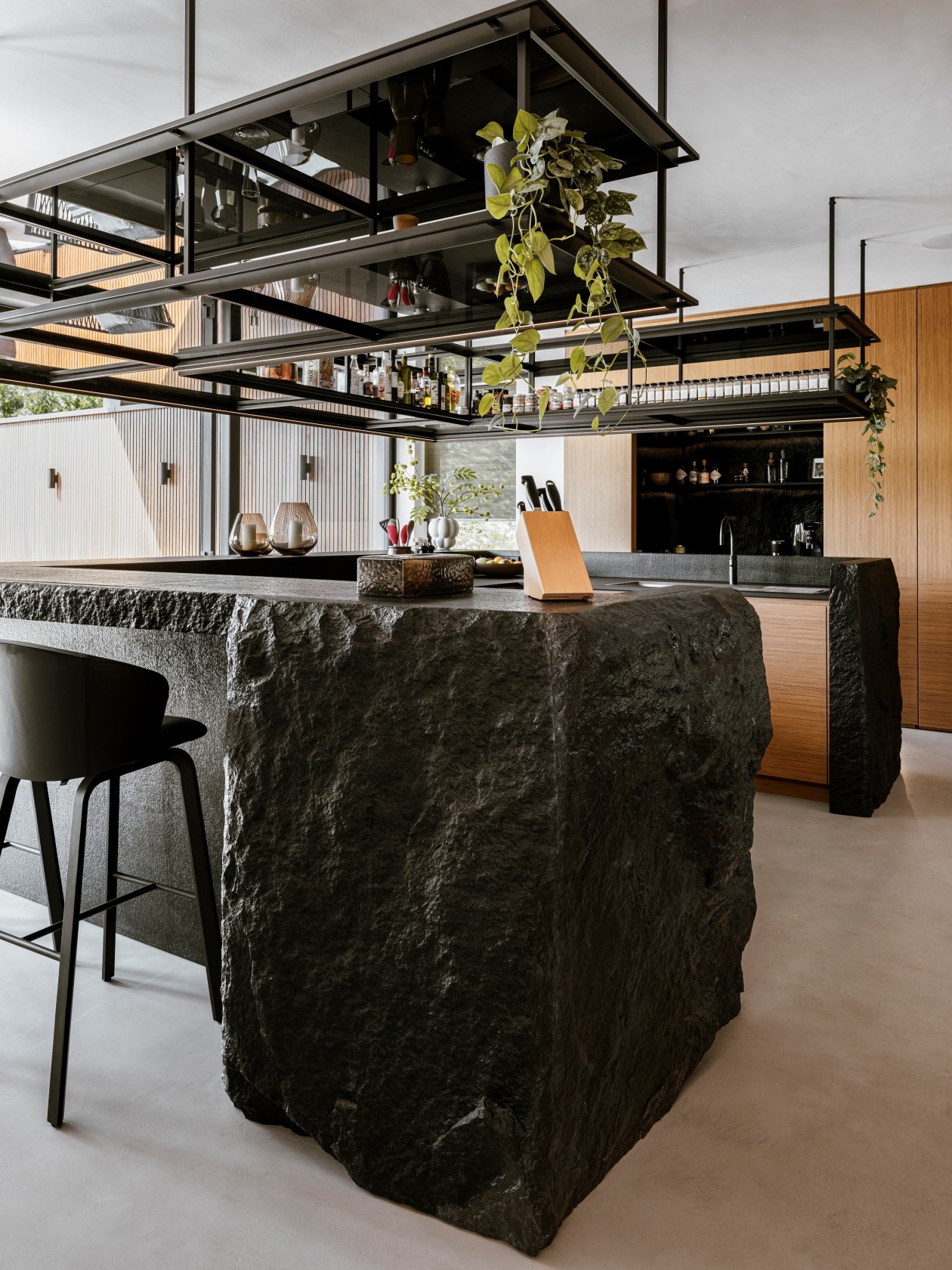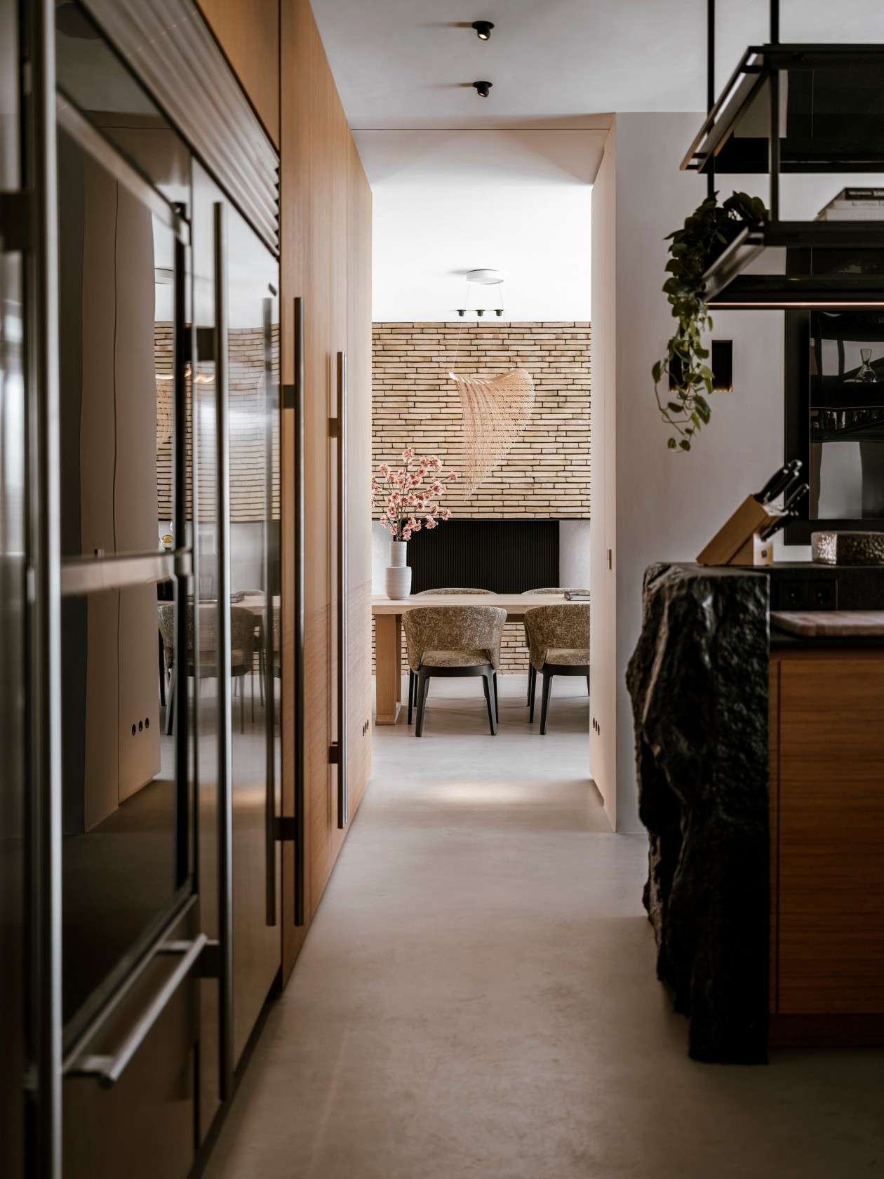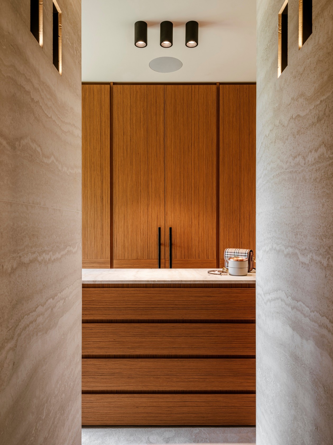 整个别墅的设计都用了预加工柚木面板,搭配石灰华和微晶粒,这三种材料结合在一起,不仅让房子结构稳固,质感也很出众。柚木的温润、石灰华的厚重加上微晶粒的细腻,让室内外都显得扎实又大气,阳光照进来时,还能看到不同材质上的光影变化,特别自然。