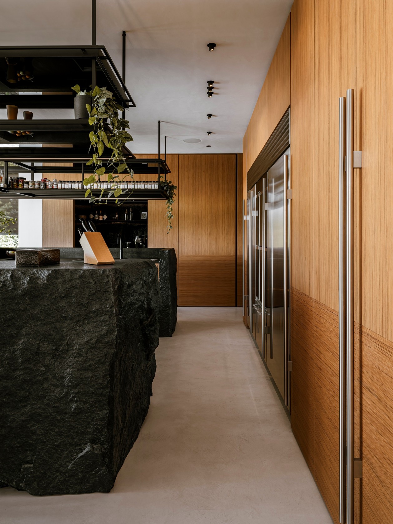 厨房是家里的核心区域,中间立着一个用坚固岩石板做的大岛台,操作空间特别宽敞。里面配的是SUBZERO和Wolf这两个牌子的电器,性能专业,不管是日常做饭还是正式宴客的大餐,都能轻松应对。浴室的设计也很用心,墙壁全是石灰华的,还做了实心圆角处理,安全又好看。有机形状的浴缸带着柚木盖子,是浴室里最显眼的部分,搭配完全定制的浴室柜,用起来既顺手又贴合需求。