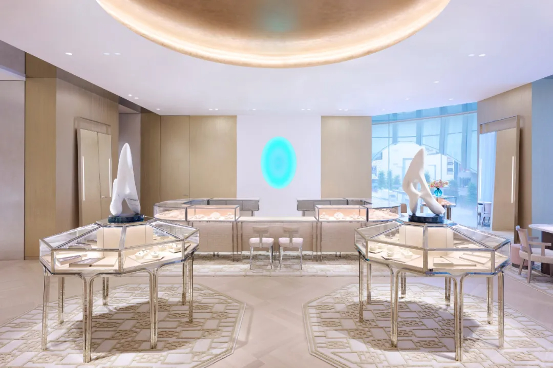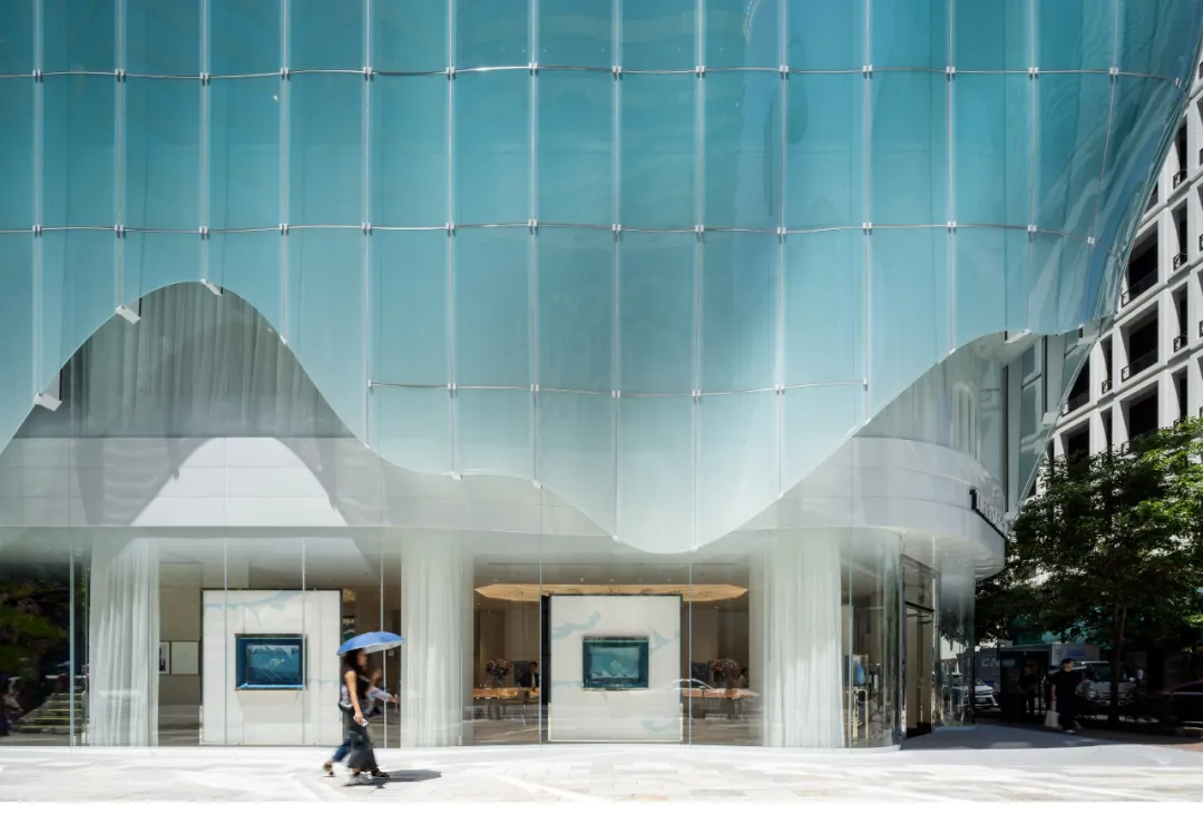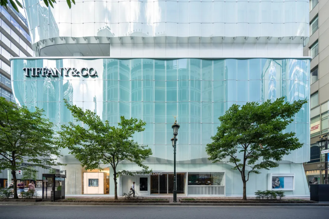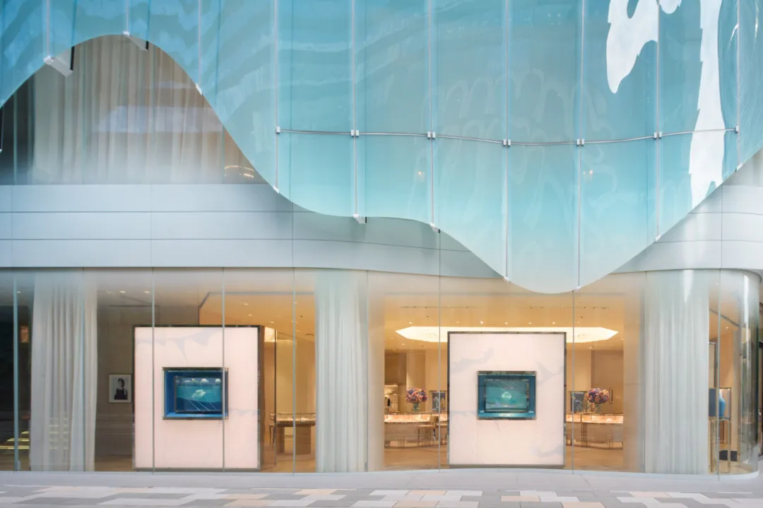 青木淳为建筑赋予了标志性的弧形半透明玻璃外衣,面板自带柔和的蒂芙尼蓝色调,阳光下泛起微光,宛如一层轻盈薄纱,他将这种质感形容为“像紫藤花架一样在微风中摇曳”,让建筑既融入街区氛围,又能在街角悄然夺目。为实现这种流动美感,每块玻璃面板都经过独立设计定制,支架角度随安装位置精准微调,其中约25%为三维曲面玻璃,既攻克了技术难题,又强化了空间的灵动性。占据建筑前四层及地下层的蒂芙尼门店内,柔和光线与轻盈纱帘衬托着珠宝陈列,设计团队特意采用陶瓷印刷技术调节光线,避免外部蓝光干扰展示效果,让空间明亮却不过分耀眼。