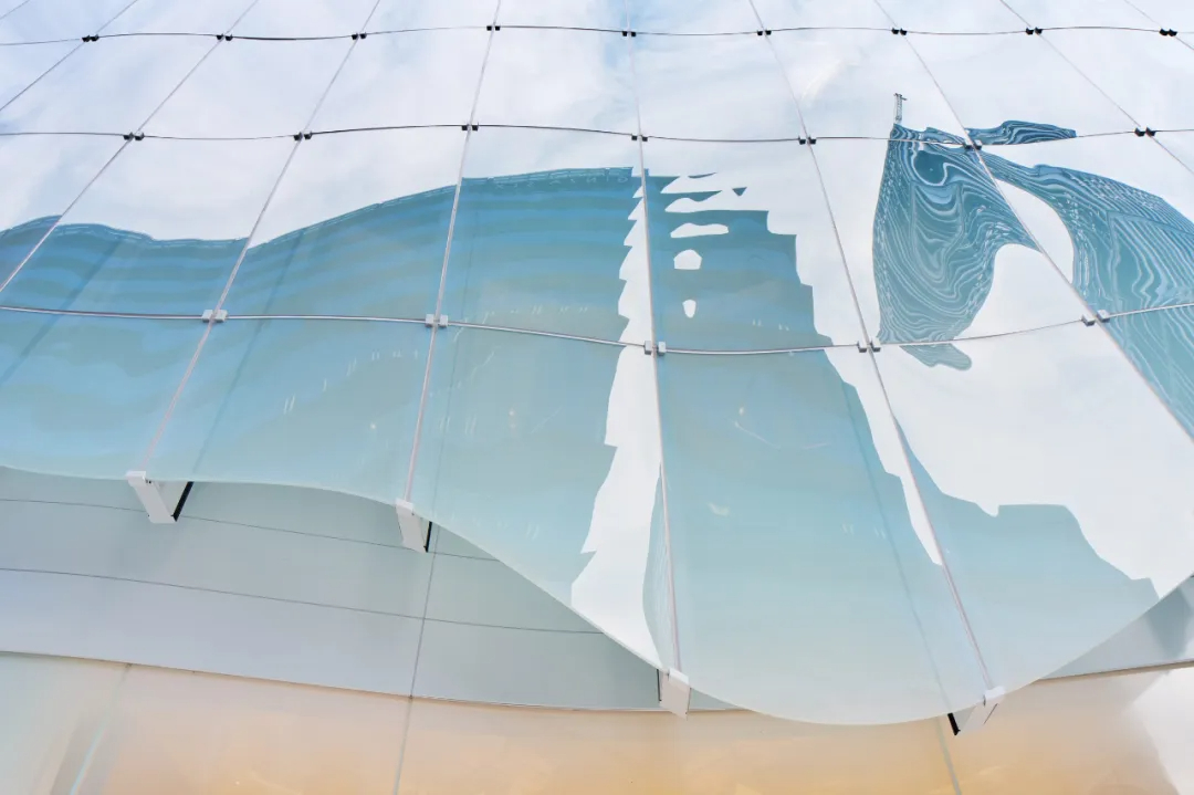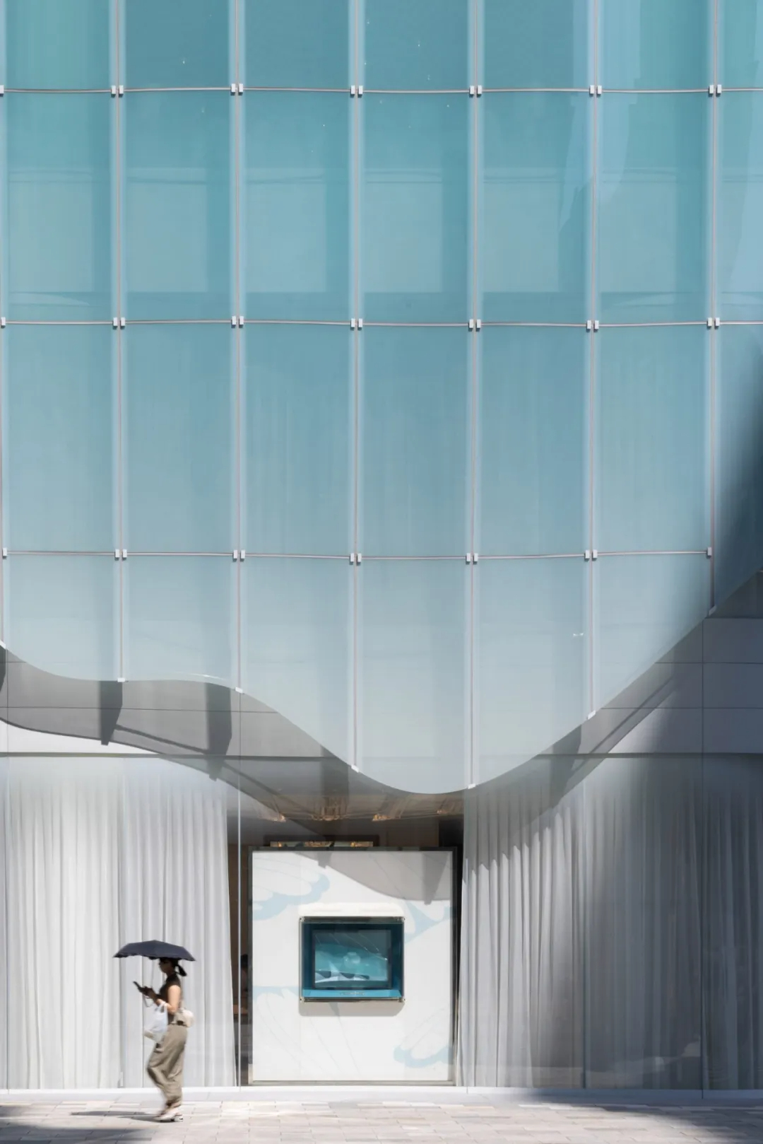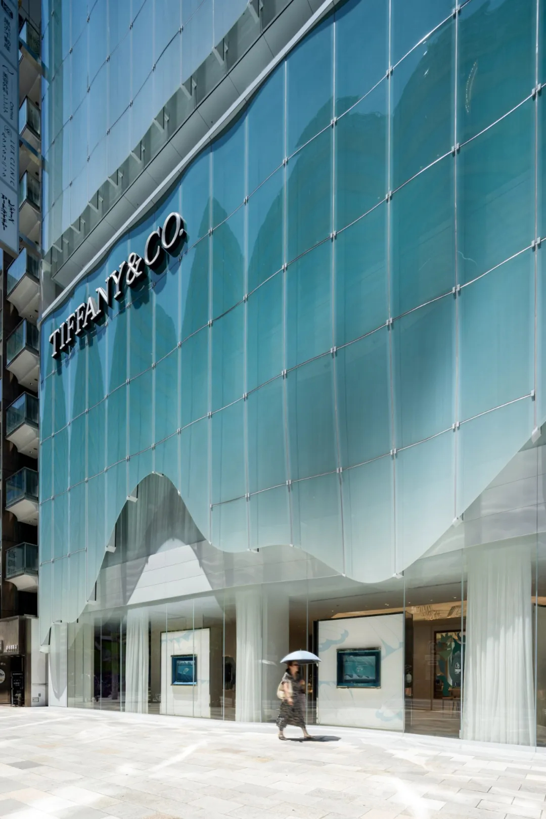 青木淳为建筑赋予了标志性的弧形半透明玻璃外衣,面板自带柔和的蒂芙尼蓝色调,阳光下泛起微光,宛如一层轻盈薄纱,他将这种质感形容为“像紫藤花架一样在微风中摇曳”,让建筑既融入街区氛围,又能在街角悄然夺目。为实现这种流动美感,每块玻璃面板都经过独立设计定制,支架角度随安装位置精准微调,其中约25%为三维曲面玻璃,既攻克了技术难题,又强化了空间的灵动性。占据建筑前四层及地下层的蒂芙尼门店内,柔和光线与轻盈纱帘衬托着珠宝陈列,设计团队特意采用陶瓷印刷技术调节光线,避免外部蓝光干扰展示效果,让空间明亮却不过分耀眼。