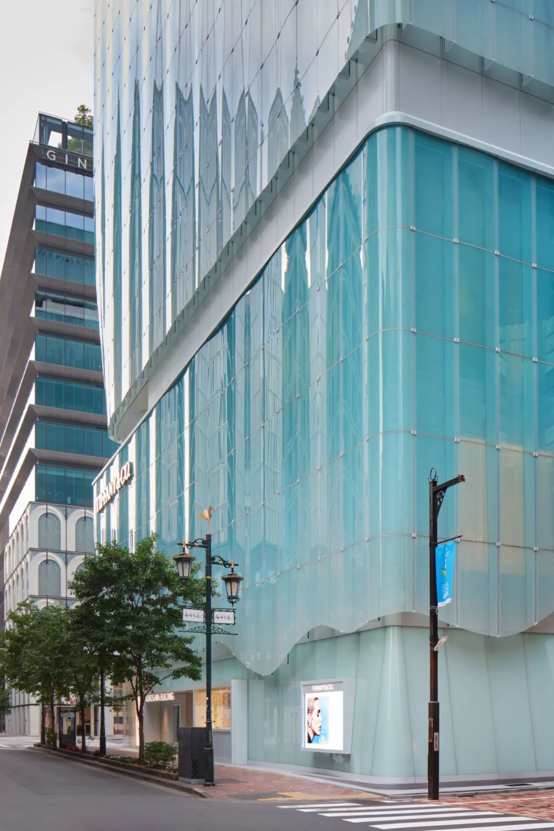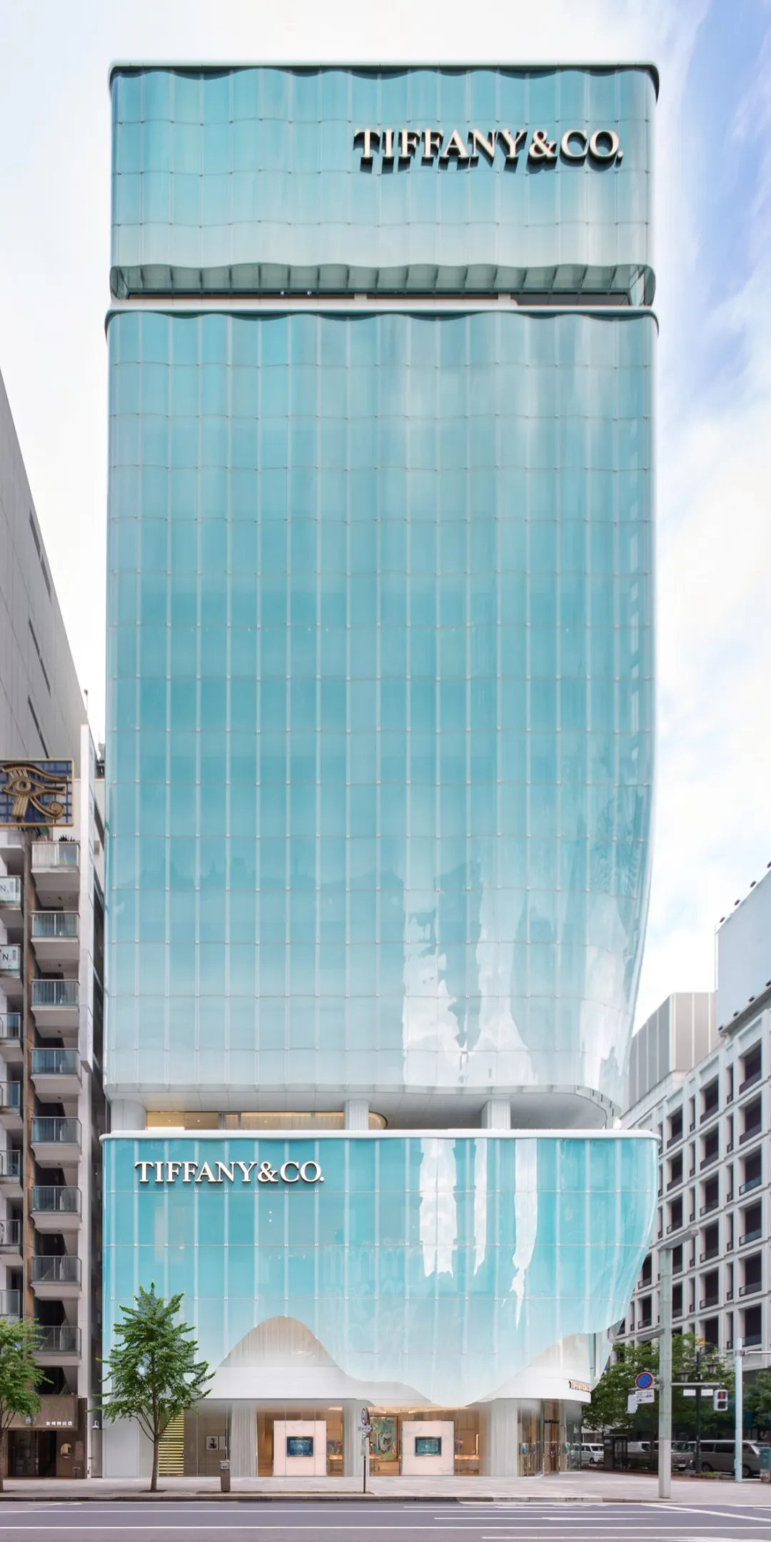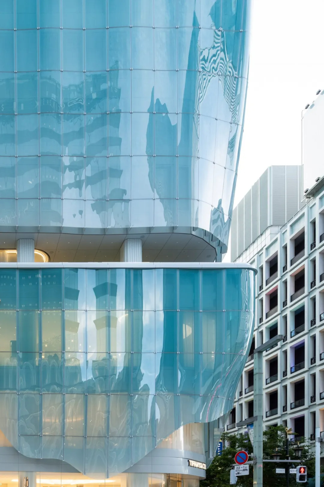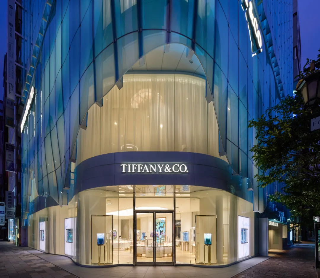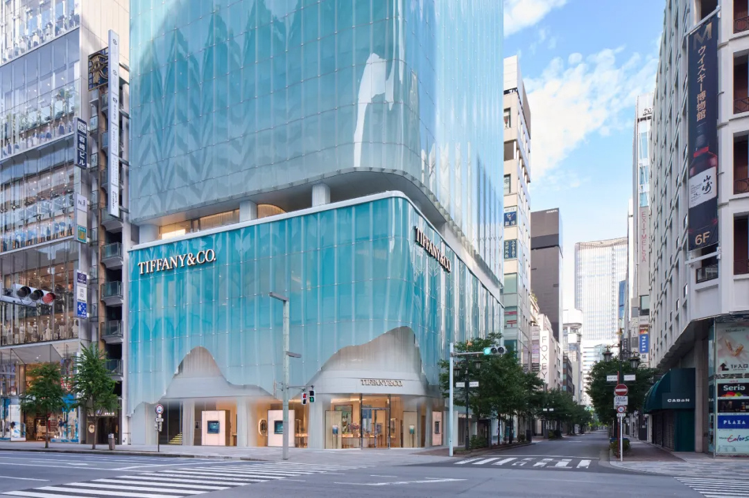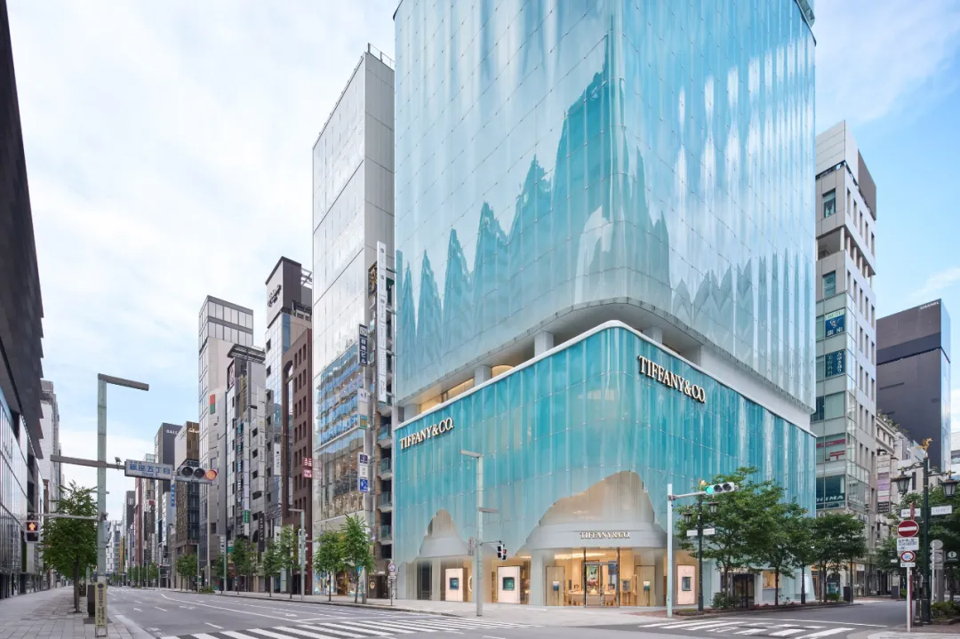 蒂芙尼(Tiffany & Co.)东京旗舰店坐落于银座繁华街角,这座由日本建筑师青木淳及其事务所Jun Aoki & Associates打造的建筑,以独特的蓝色半透明曲线玻璃立面成为城市新焦点。建筑占地约2450㎡,高66米共13层,采用三段式体量划分功能——下层是蒂芙尼门店,中层为办公区域,上层则设有餐厅与景观露台,在密集的城市肌理中清晰呈现空间逻辑。