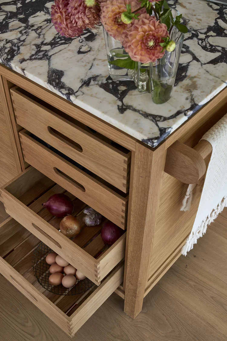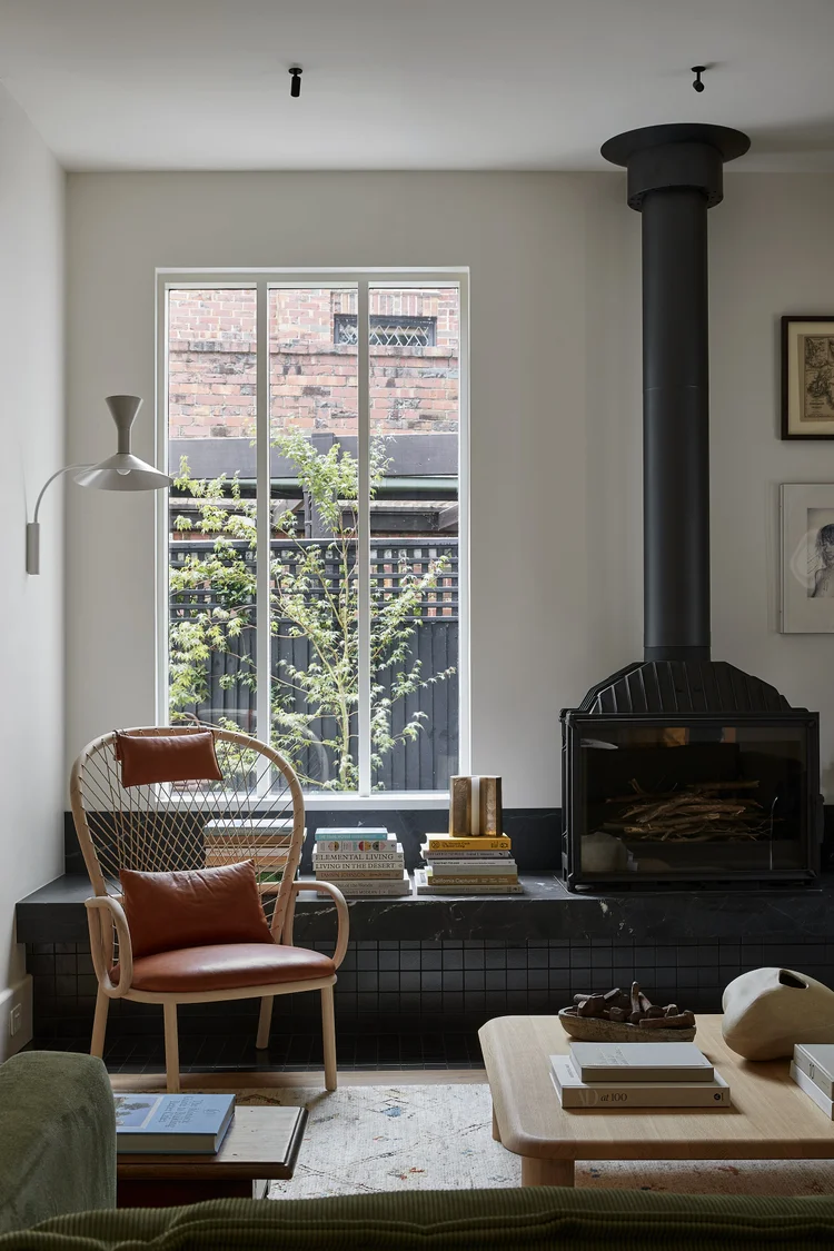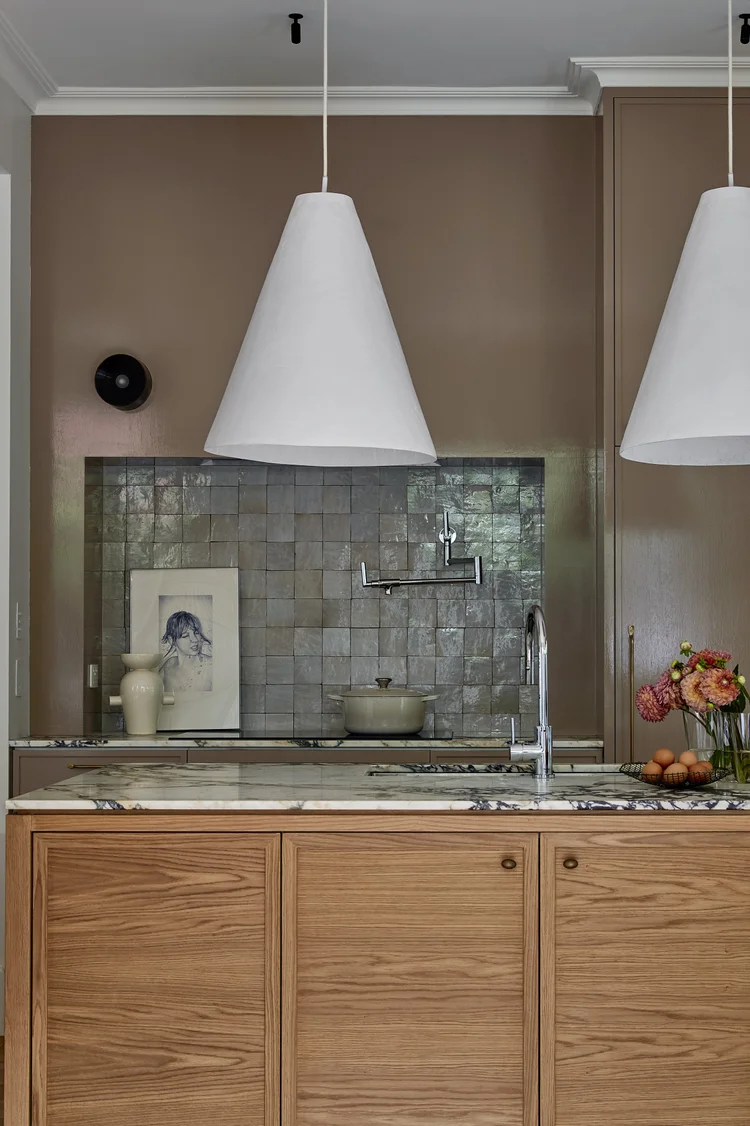 设计中精心定制的木作部分尤为巧妙,它们甚至经过手工描绘,被赋予了一种微妙的模糊性:这些橱柜和单元看起来既像是房屋原有的,又仿佛是业主随身带来的旧物,新旧界限在此变得诗意。