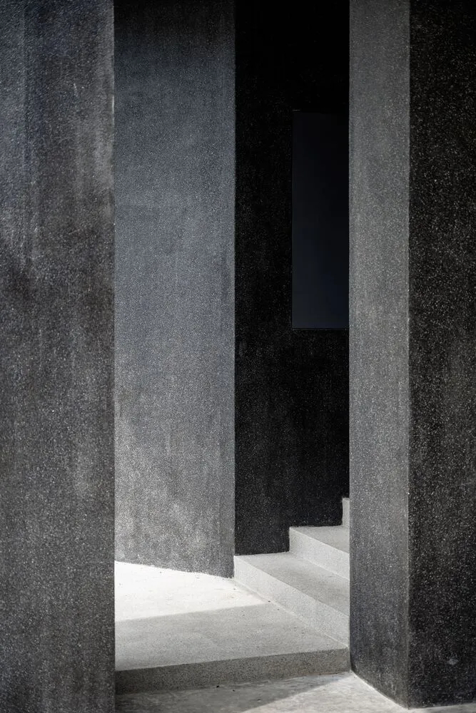 建筑由两个对比鲜明的体量构成:下部以深灰至近黑色的材质塑造,模拟出如山基般沉稳的底座;上部则是一个纯净的白色盒子,外覆同色铝制百叶,在维护隐私的同时,赋予建筑轻盈与通透之感。这种清晰的体量对比,使住宅在郁郁葱葱的自然背景中既凸显又和谐。