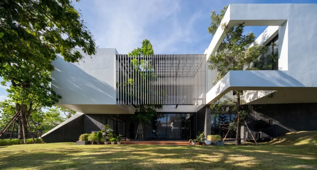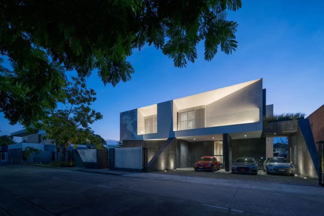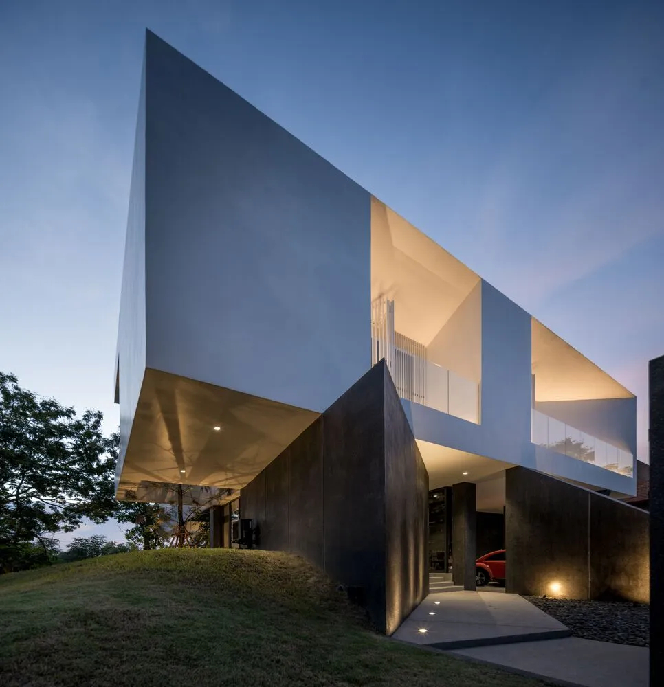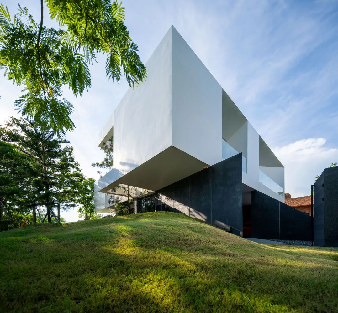 在泰国克特帕威一片湖泊与树木环绕的自然场地中,HAA Studio 设计了一座与景观深度融合的住宅。业主渴望拥有一个独特而具强烈记忆点的家,因此建筑师将建筑视为自然景观的延伸——宛如一座从黑色岩石山体中生长而出的白色形体。