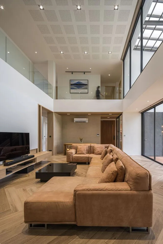 功能布局延续了这一隐喻:私密的卧室位于建筑最高处的白色体量中,形成静谧独立的休憩空间;而日常生活与活动区域则布置在下层,向庭院与后方湖泊敞开,如同依山而建的开放平台,与自然紧密相连。