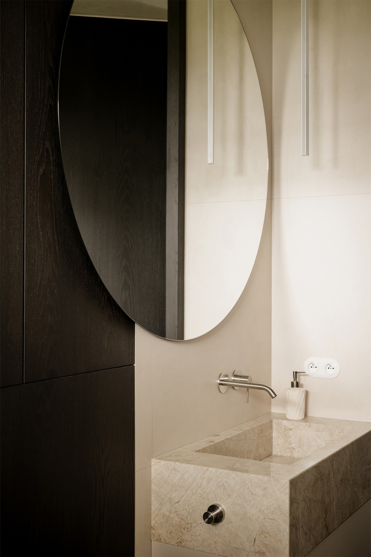 主卫的灵感源于“古村石窟的偶然发现”。设计师让墙体呈阶梯式向内收折,入口宽阔而仪式感十足。光线沿着石壁滑落,渐渐引导视线至深处那块厚重的大理石台面。温润的石灰岩包裹着空间,而一盏以褶皱瓷与黄铜组成的壁灯静静悬于上方,使整个浴室如同一段尘封的欧洲传说被重新唤醒。