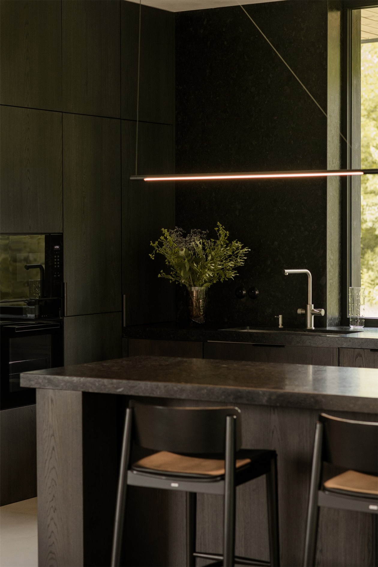 厨房承担着另一种意义。它不仅是料理的场所,更是家人相聚、分享丰收与轻松玩笑的舞台。橱柜与石材的泥土色调回应着窗外景致,细腻的工艺让空间散发温度。屋主最爱的片刻,是与家人围在大岛台边烘焙饼干,或用果园的果实现榨果汁——生活被自然浸润,也因此更加满足。