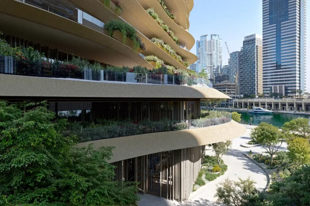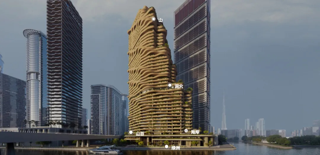 项目的核心灵感源于“水与沙的自然流动”。建筑立面摒弃了玻璃幕墙的冰冷,以层叠错落的造型模仿沙漠风蚀地貌与流水波纹,构筑出一座充满动态韵律的“垂直山谷”。这种将自然形态抽象化于现代建筑的手法,让塔楼本身成为连接城市与自然的雕塑。
